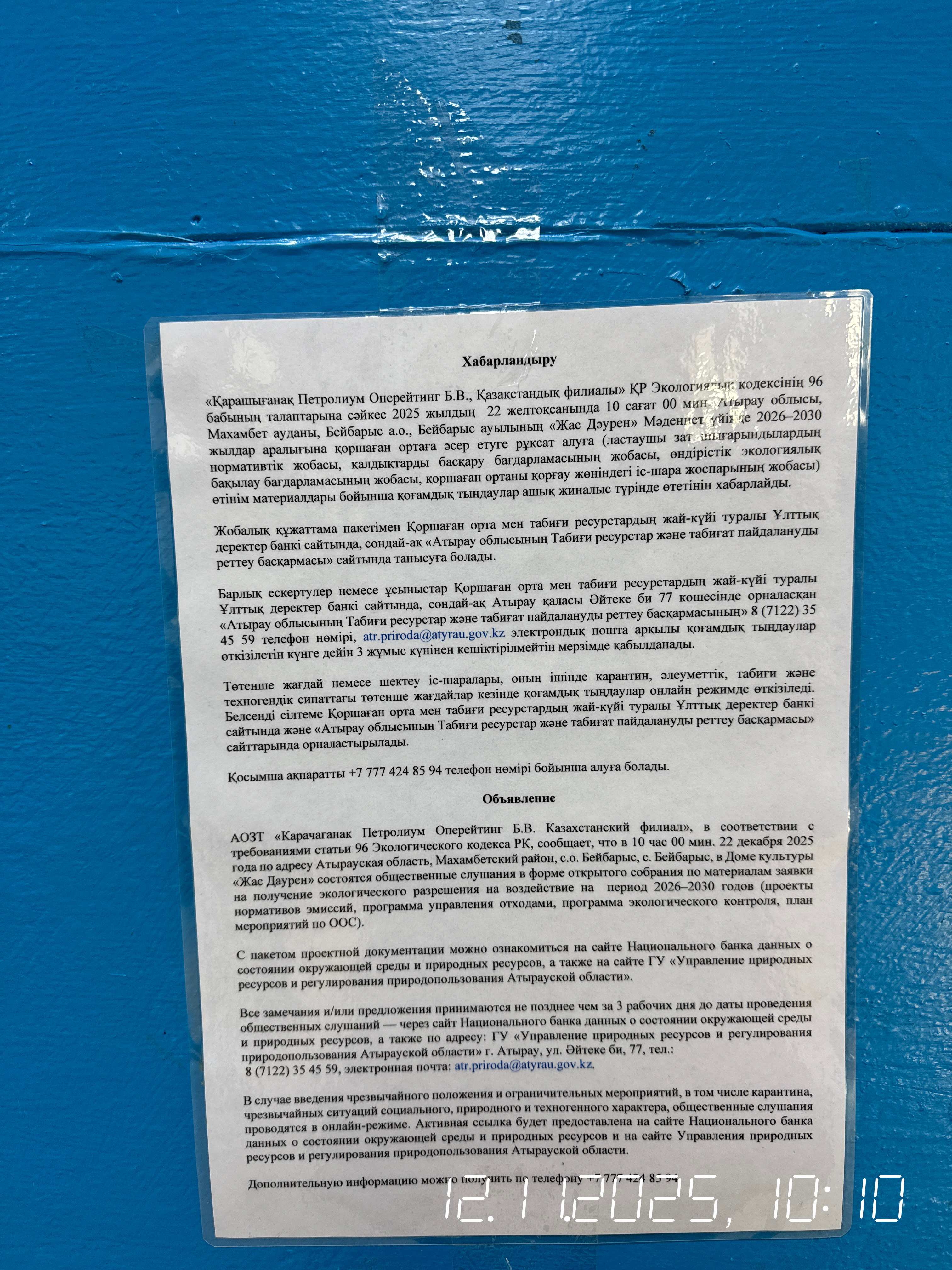 3. Общественные слушания организованны: Управление природных ресурсов и регулирования природопользования Атырауской области, atr.priroda@atyrau.gov.kz,