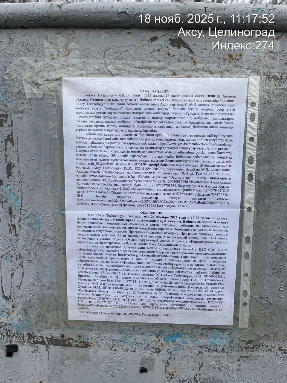 4. Повестка дня общественных слушаний: Почтовый адрес ТОО «Аксу Technology»: Республика Казахстан, Акмолинская обл., г. Степногорск, 5 микрорайон, д. 6. Административно п. Аксу относится к г. Степногорск. Ближайшим крупным населенным пунктом является г. Степногорск, расположенный на расстоянии около 18 км от объектов. Город Астана и г. Кокшетау расположены на расстоянии 200 и 250 км. С этими населенными пунктами рудник Аксу соединен шоссейными дорогами с асфальтовым покрытием. .Материалы для получения экологического разрешения на воздействие (проекты: Нормативов допустимых выбросов, Нормативов допустимых сбросов, Программа управления отходами, Программа производственного экологического контроля, План мероприятий по охране окружающей среды) для ТОО «Аксу Technology» с учетом Раздела «Охрана окружающей среды» к проекту «Корректировка проекта строительства хвостохранилища № 2» в поселке Аксу Акмолинской области