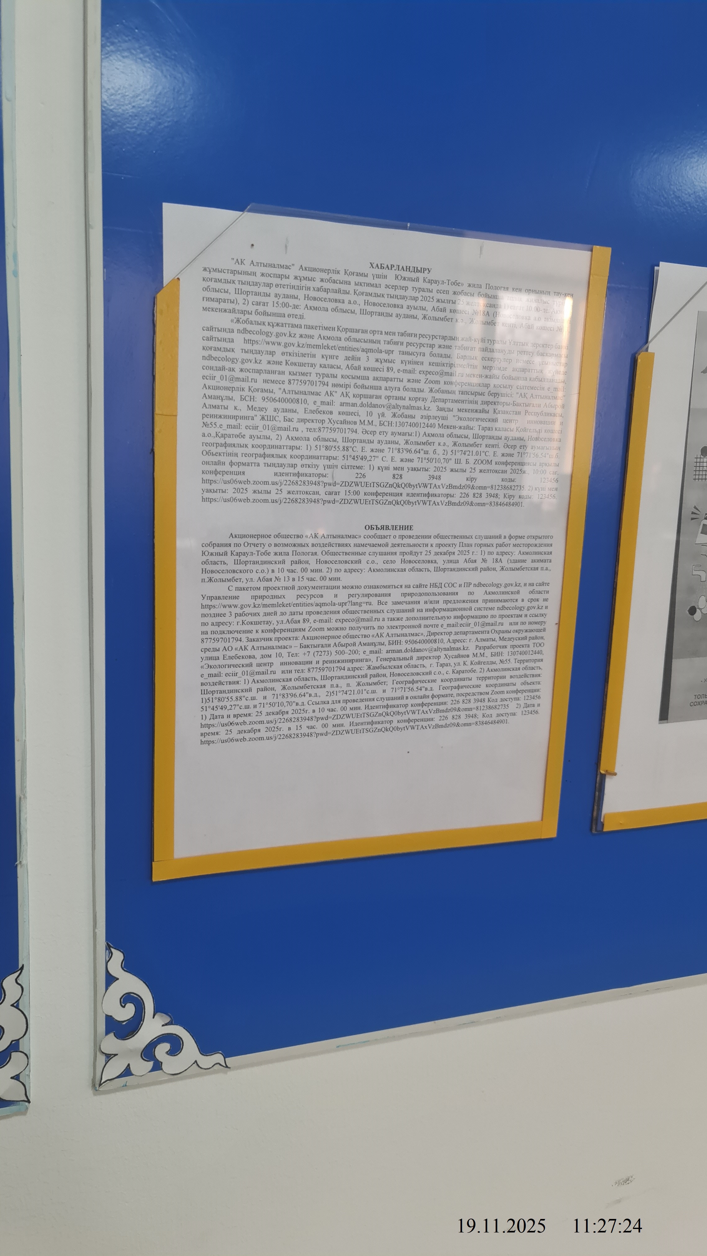 1.2. Место проведения: Акмолинская область, Шортандинский район, Жолымбетская п.а., п.Жолымбет, ул. Абая № 13. Ссылка для проведения слушаний в онлайн формате: Идентификатор конференции: 226 828 3948; Код доступа: 123456. https://us06web.zoom.us/j/2268283948?pwd=ZDZWUEtTSGZnQkQ0bytVWTAxVzBmdz09&omn=83846484901