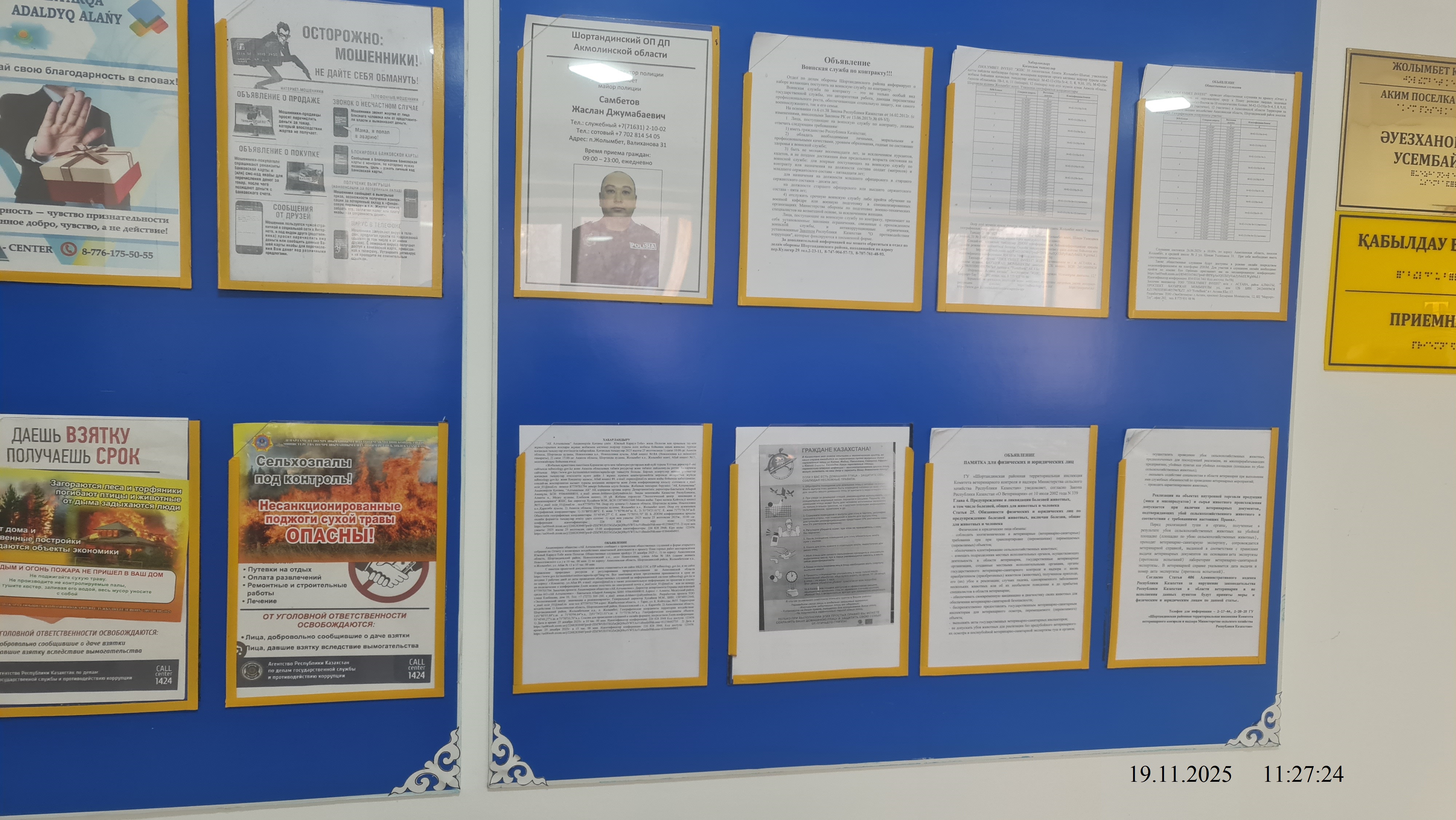 6.3. расположение мест, специально предназначенных для Размещения печатных объявлений (доски объявлений): Акмолинская область, Шортандинский район, Жолымбетская п.а., п. Жолымбет улица Абая 9 доска объявлении акимата п. Жолымбет