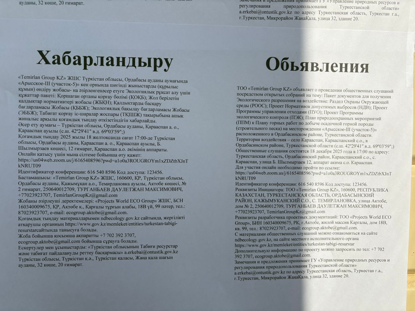 3. Общественные слушания организованны: Управление природных ресурсов и регулирования природопользования Туркестанской области, a.erkebai@ontustik.gov.kz,