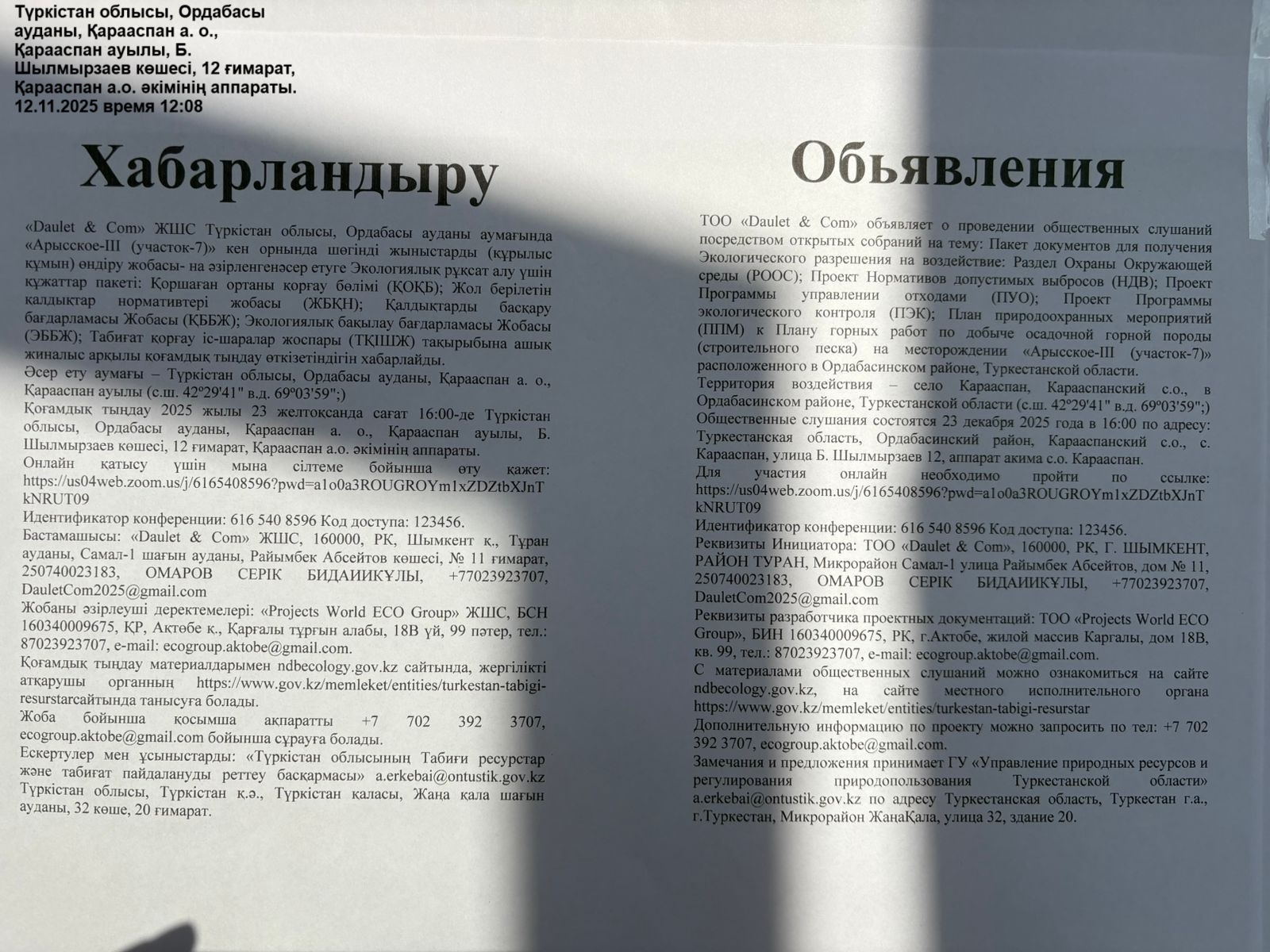3. Общественные слушания организованны: Управление природных ресурсов и регулирования природопользования Туркестанской области, a.erkebai@ontustik.gov.kz,