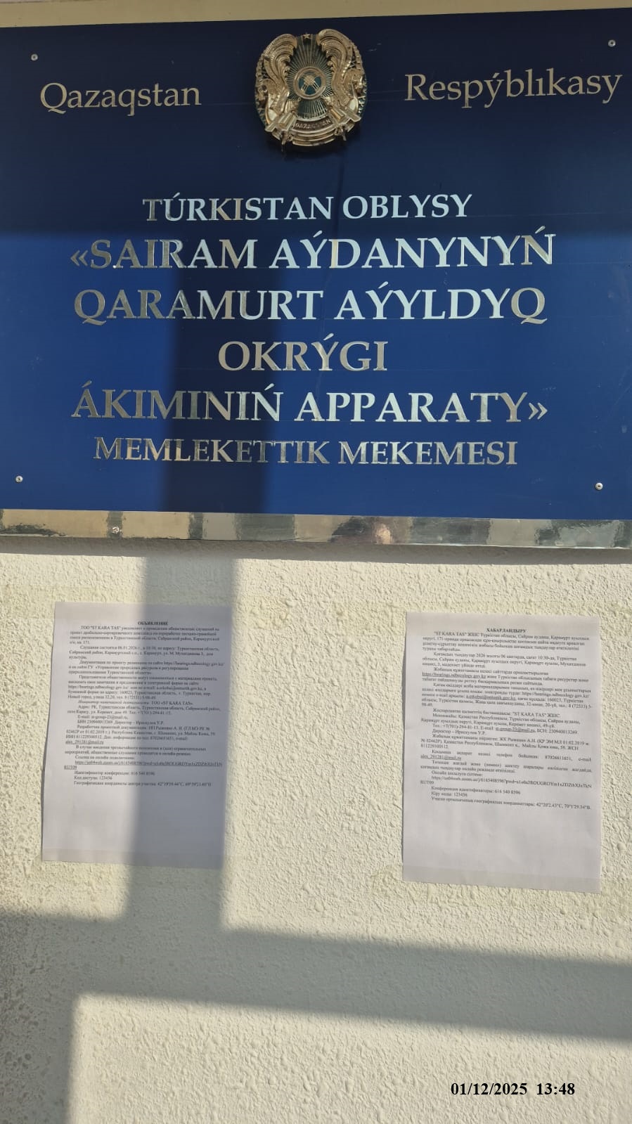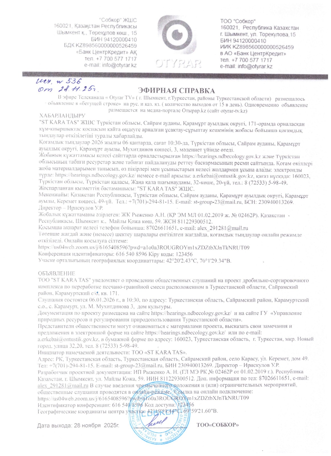 3. Общественные слушания организованны: Управление природных ресурсов и регулирования природопользования Туркестанской области, a.erkebai@ontustik.gov.kz,