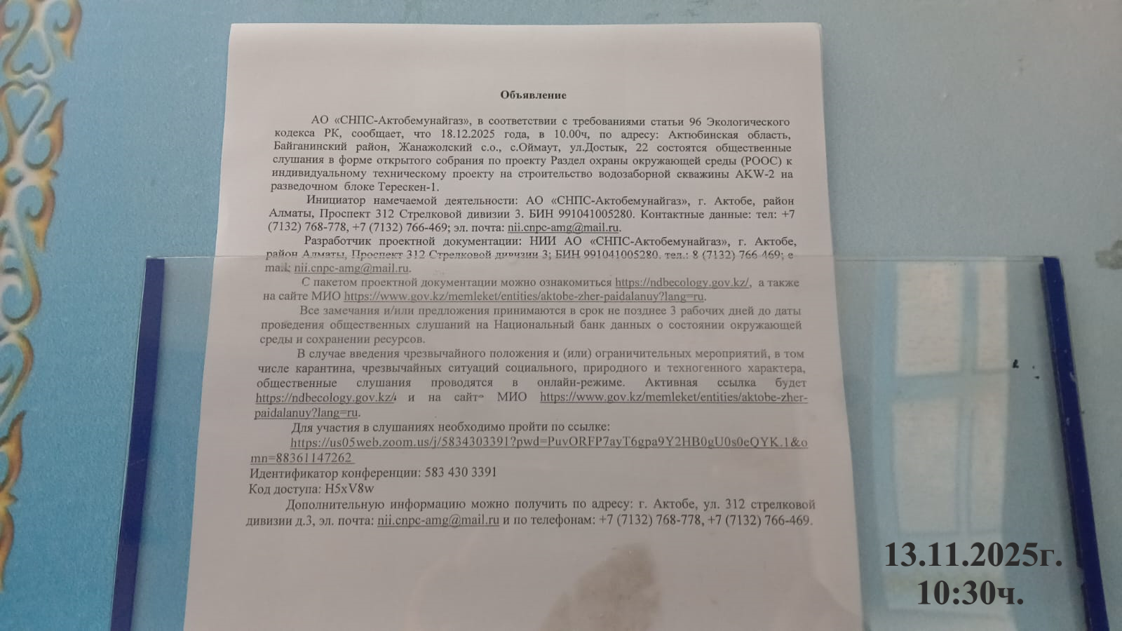4. Повестка дня общественных слушаний: В административном отношении разведочный блок Терескен-1 входит в состав Байганинского района Актюбинской области Республики Казахстан. Цель бурения – разведочно – эксплуатационная. Назначение скважин – для технического водоснабжения. Глубина проектной скважины АКW-2 на воду составляет 470м для обеспечения технической водой бурение глубоких нефтяных скважин. Тема: Раздел «ОХРАНА ОКРУЖАЮЩЕЙ СРЕДЫ» к индивидуальному техническому проекту на строительство эксплуатационной водозаборной скважины AKW-2 на разведочном блоке Терескен-1. Для участия в слушаниях необходимо пройти по ссылке: https://us05web.zoom.us/j/5834303391?pwd=PuvORFP7ayT6gpa9Y2HB0gU0s0eQYK.1&omn=88361147262 Идентификатор конференции: 583 430 3391 Код доступа: H5xV8w