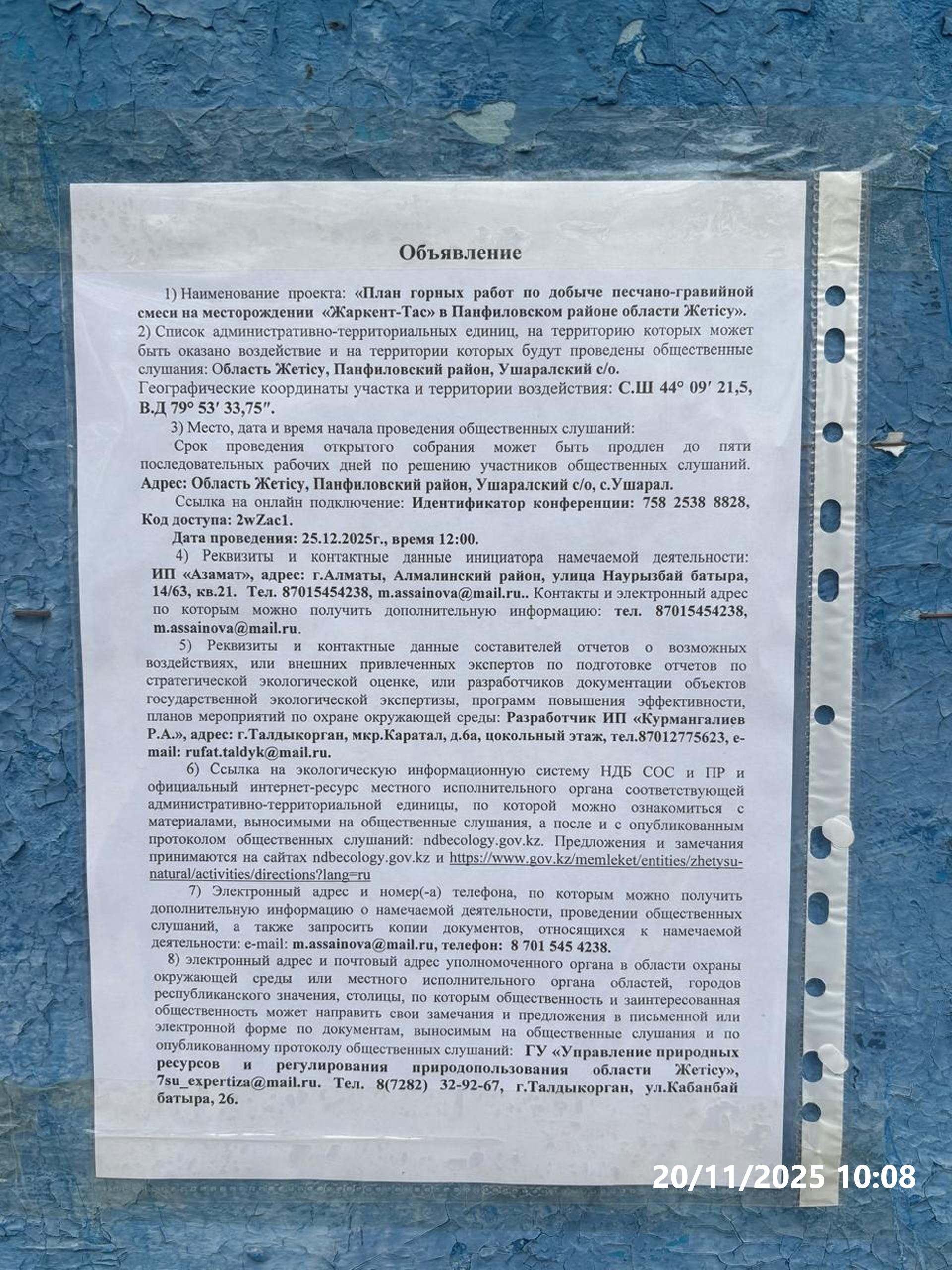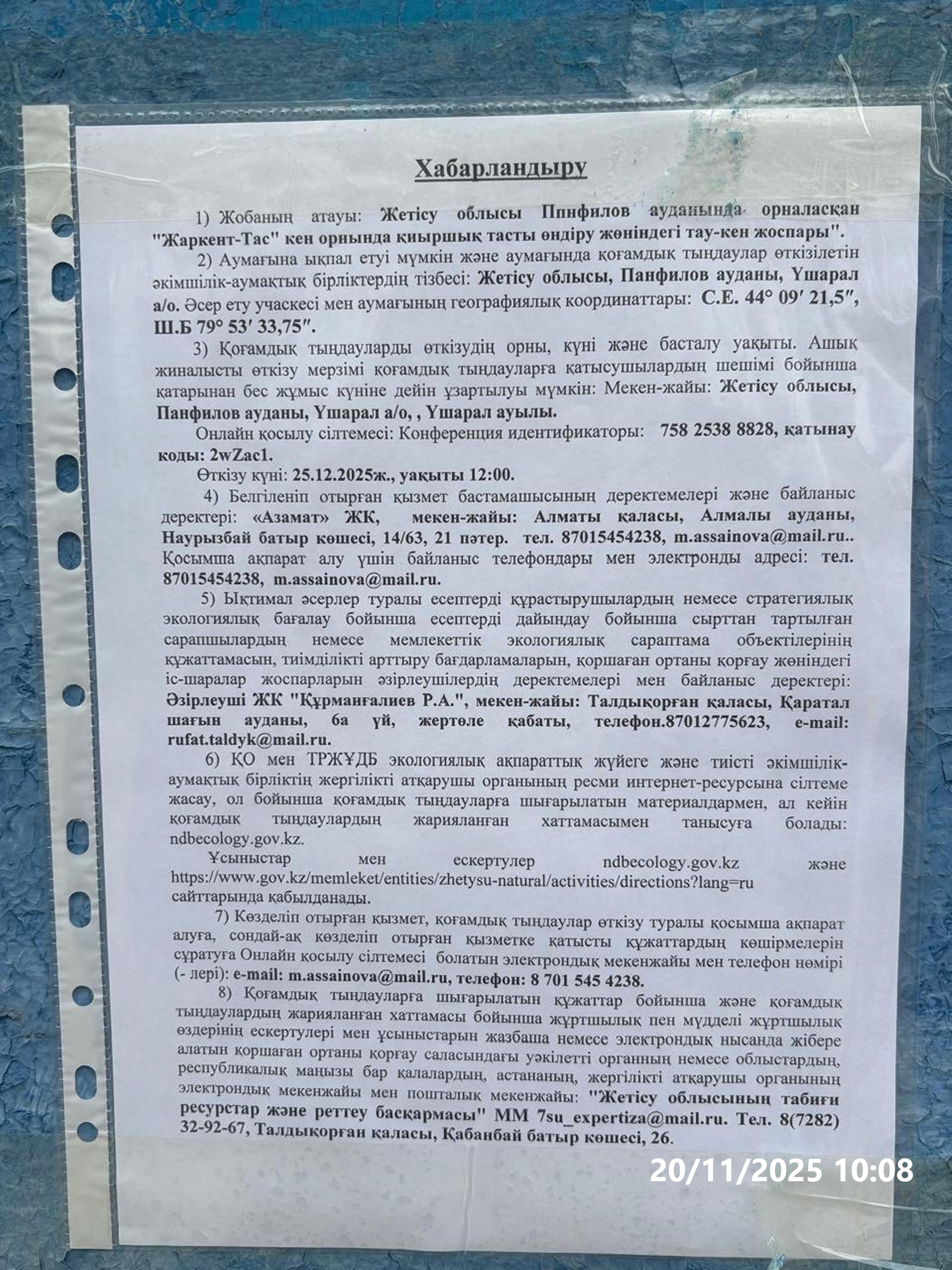 3. Общественные слушания организованны: Главный специалист УПР и ПР Жетысуйской области, priroda@zhetisu.gov.kz,