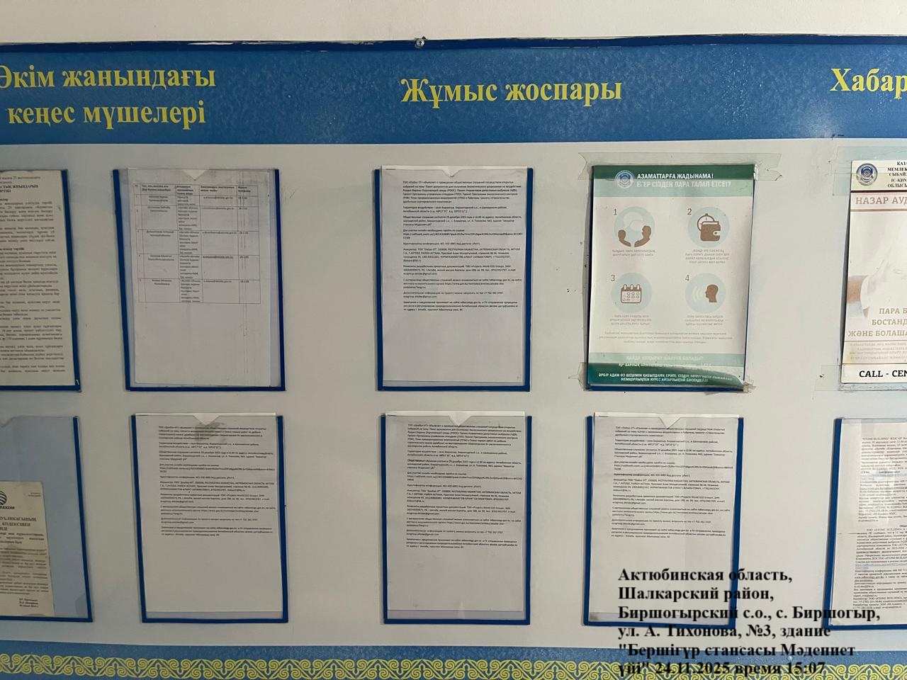 6.3. расположение мест, специально предназначенных для Размещения печатных объявлений (доски объявлений): Актюбинская область, Шалкарский район, Биршогырский с.о., с.Биршогыр, ул. А. Тихонова, №3, здание "Бершігүр стансасы Мәдениет үйі"