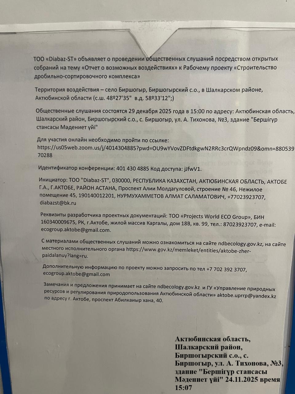 По проекту: ТОО «Diabaz-ST» объявляет о проведении общественных слушаний посредством открытых собраний на тему «Отчет о возможных воздействиях» к Рабочему проекту «Строительство дробильно-сортировочного комплекса»