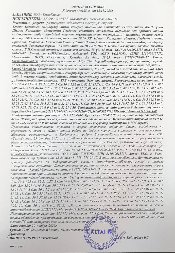 3. Общественные слушания организованны: Управление природных ресурсов и регулирования природопользования Восточно-Казахстанской области, g.zhunisbekova@akimvko.gov.kz,