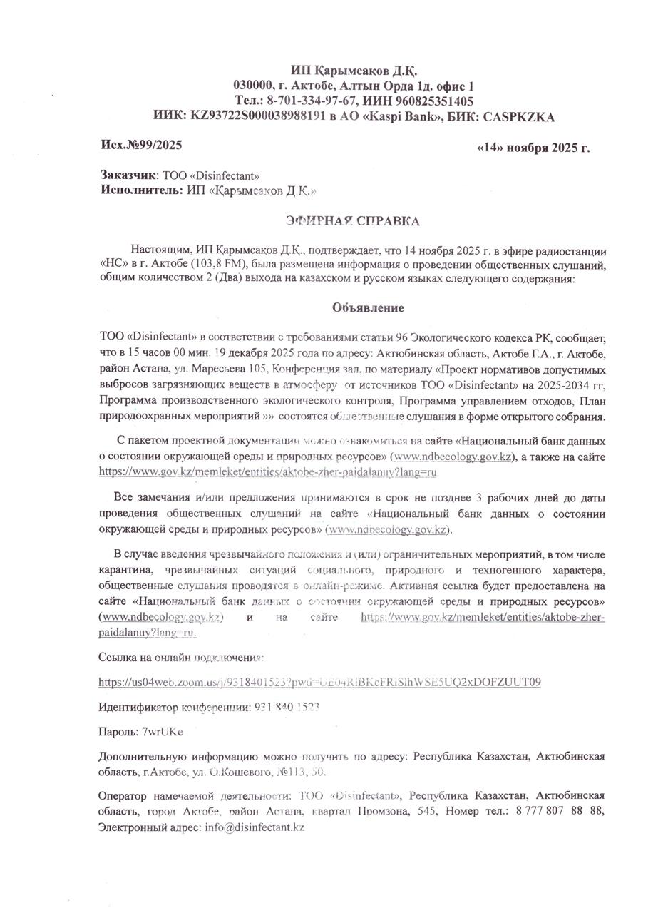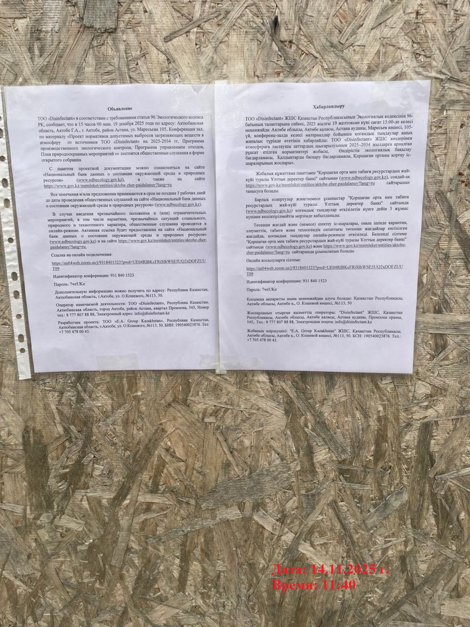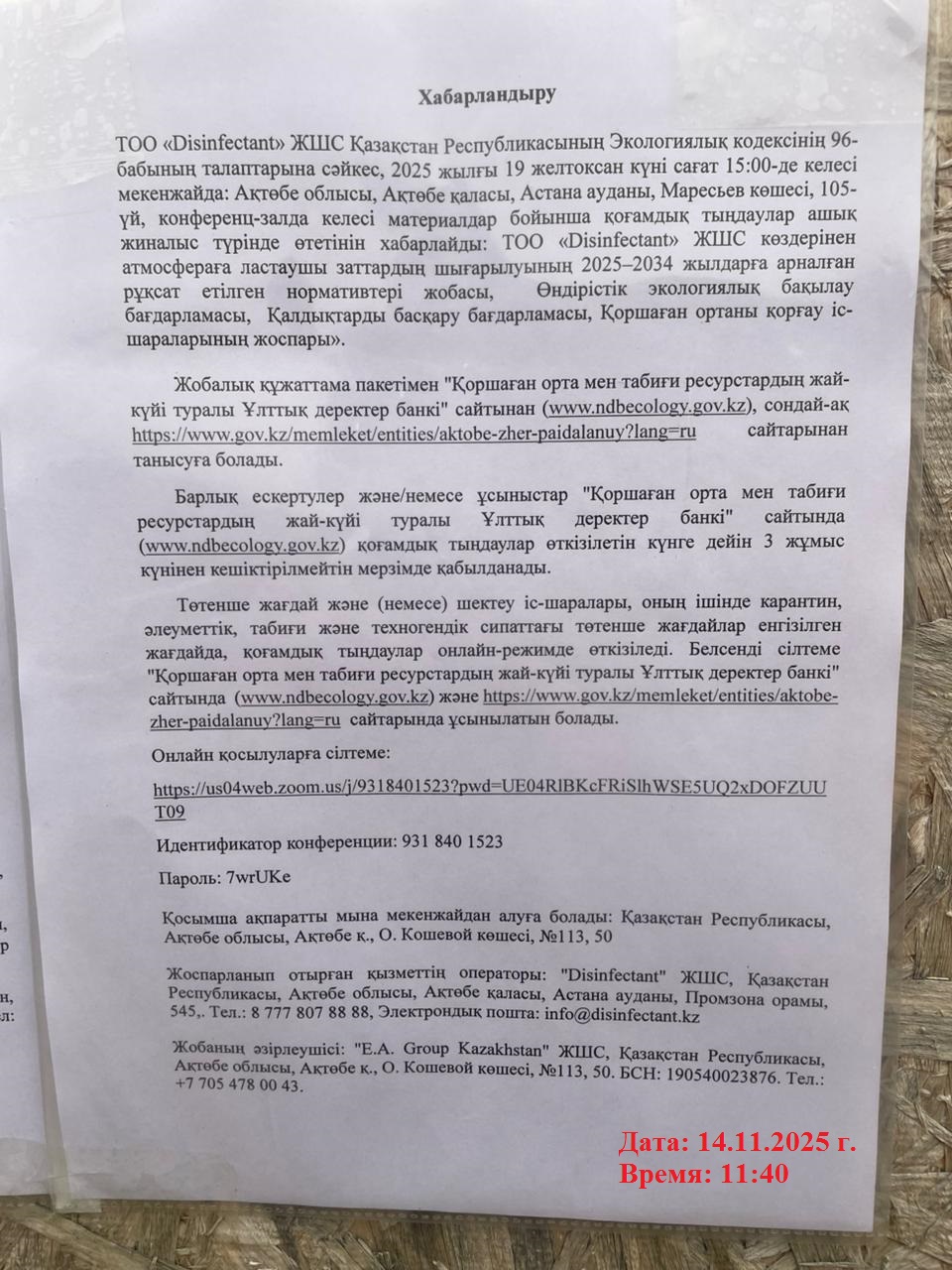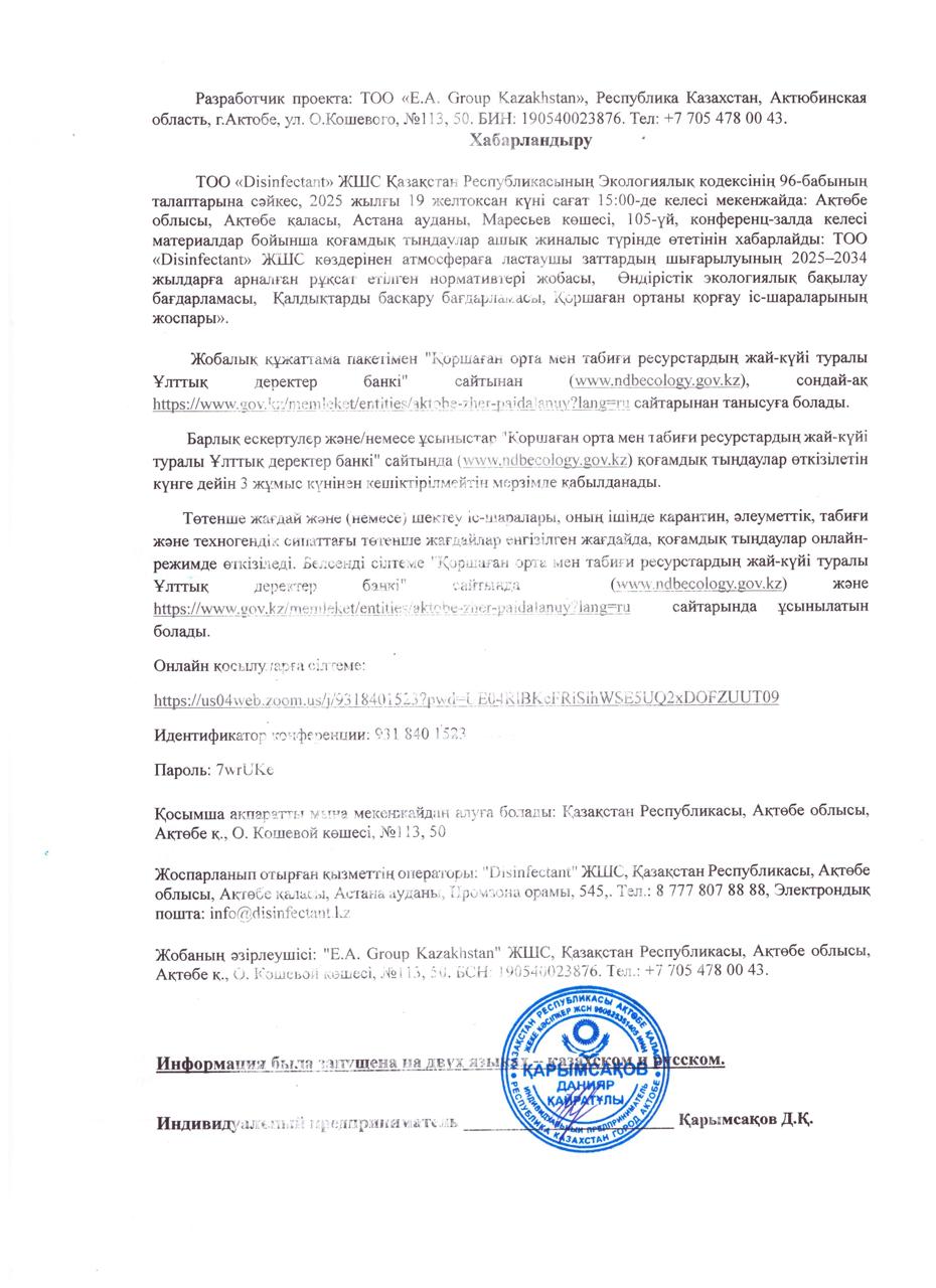 4. Повестка дня общественных слушаний: Наименование: ТОО «Disinfectant». БИН 200640026006 Юр. адрес: Актюбинская область, город Актобе, район Астана, квартал Промзона, 545 Вид деятельности: Основной деятельностью предприятия является Производство прочих химических продуктов. (ОКЭД 38220). ТОО "Disinfectant" осуществляет производство растворителя тарговой марки "SOLVENT PRO". В административном отношении участок расположен в городе Актобе, района Астана, квартал Промзона, уч. 545. Объект расположен в промышленной зоне. Ближайшая жилая зона – жилой район города Актобе расположен юго-восточнее участка на расстоянии более 1 км. Целевое назначение – размещение и обслуживание производственных объектов. Площадь участка 1,5 га. Сроки использования – согласно акта на землю не установлены, так как участок находится в частной собственности ТОО "Disinfectant". Координаты угловых точек границ участка: 1 - 50°18´28,73ʺС, 57°07´09,20ʺВ, 2 - 50°18´30,74ʺС, 57°07´11,97ʺВ, 3 - 50°18´25,91ʺС, 57°07´15,27ʺ, 4 - 50°18´25,01ʺС, 57°07´11,76ʺВ. Ссылка на онлайн подключения: https://us04web.zoom.us/j/9318401523?pwd=UE04RlBKcFRiSlhWSE5UQ2xDOFZUUT09 Идентификатор конференции: 931 840 1523 Пароль: 7wrUKe