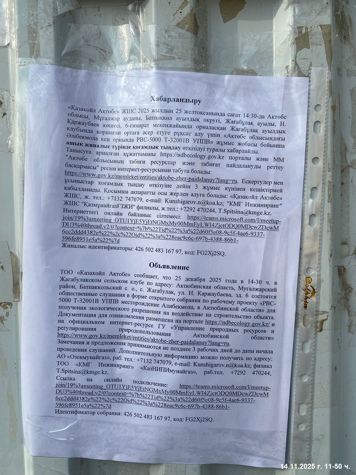 6. Объявление о проведении общественных слушаний на казахском и русском языках будет распространено следующими способами: