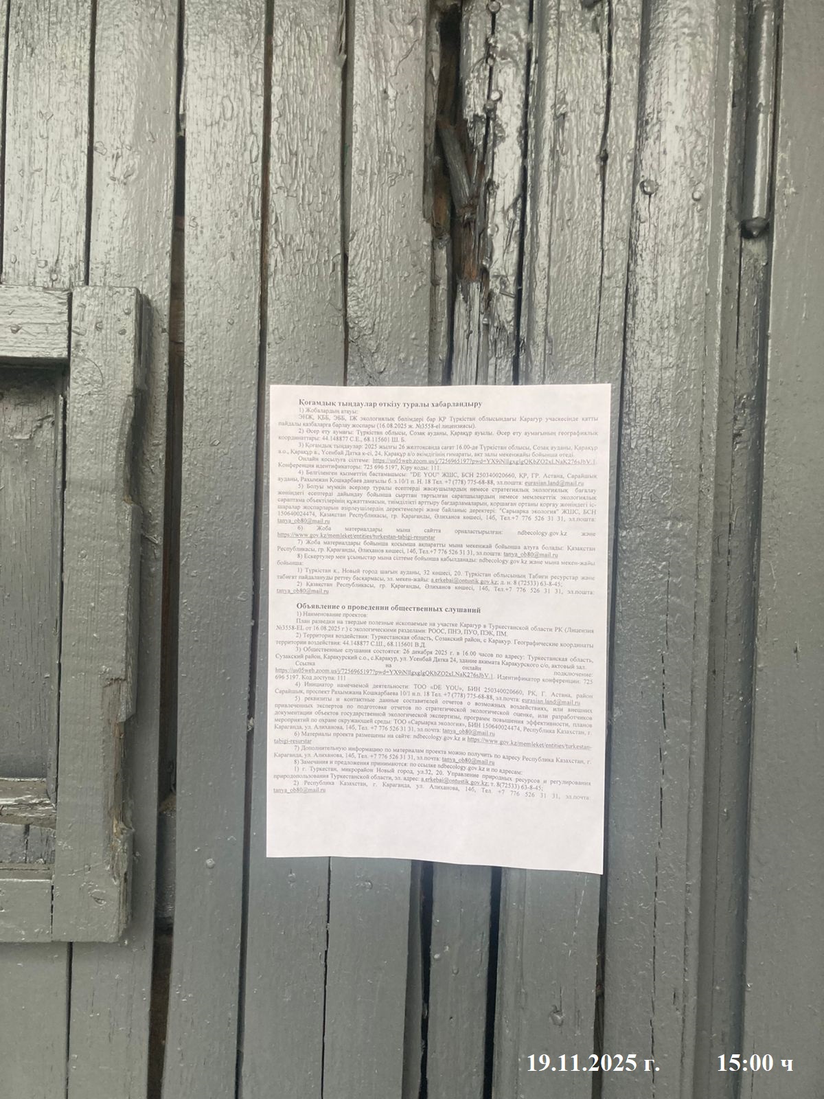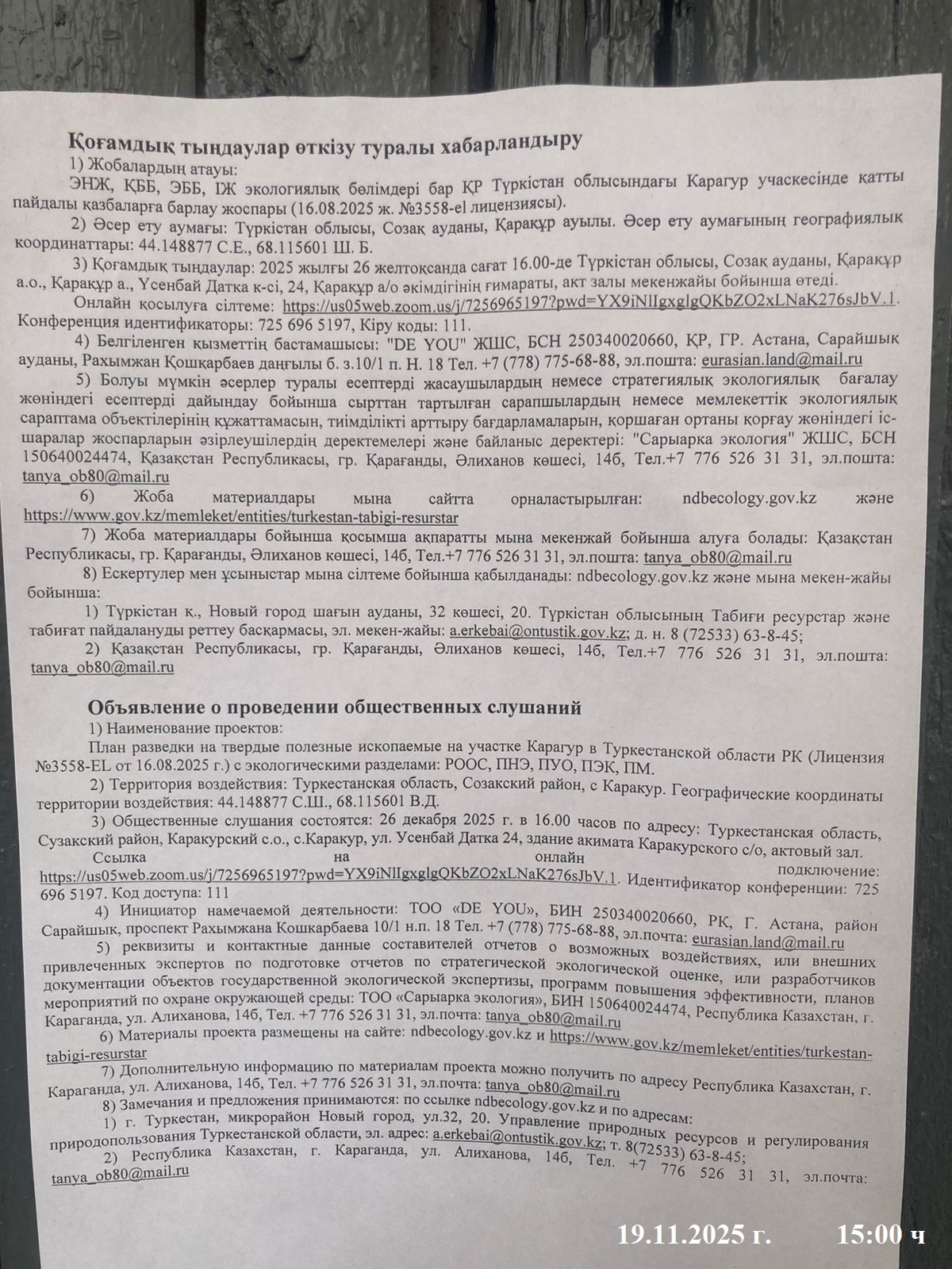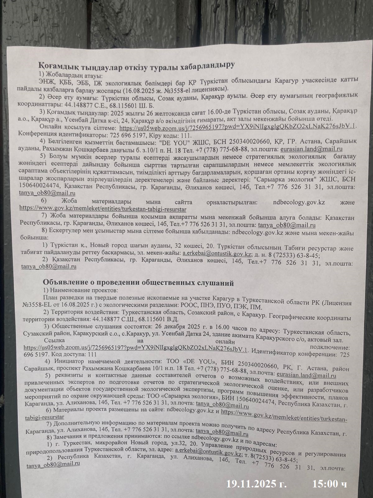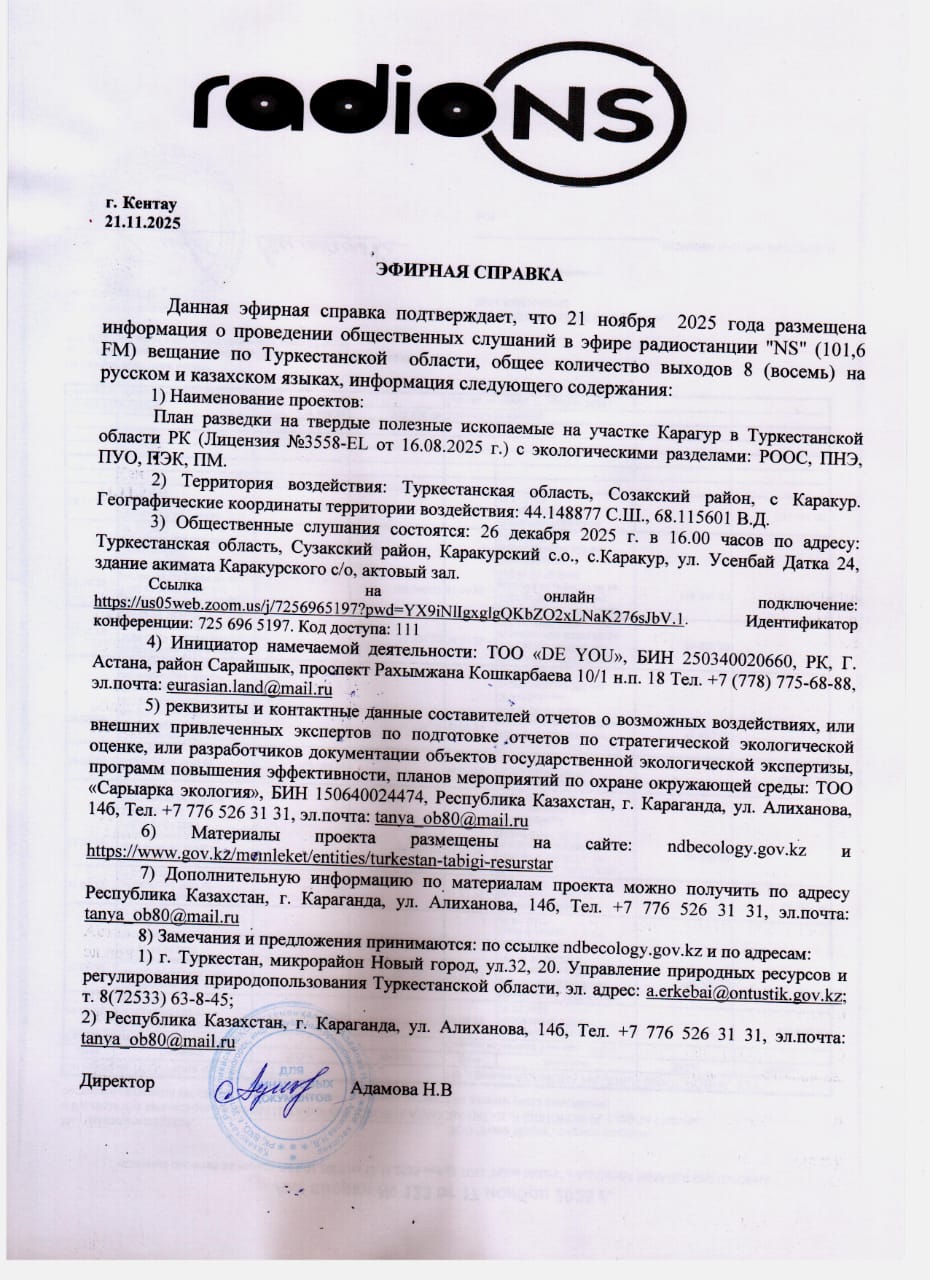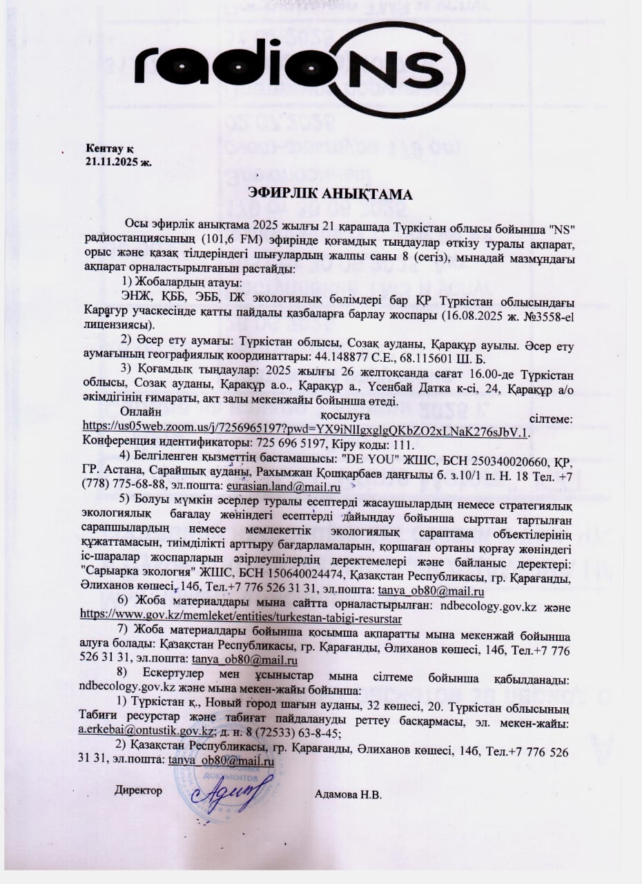 3. Общественные слушания организованны: Управление природных ресурсов и регулирования природопользования Туркестанской области, a.erkebai@ontustik.gov.kz,