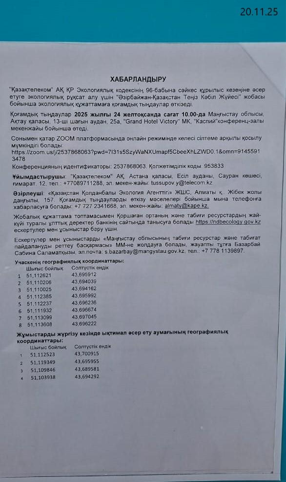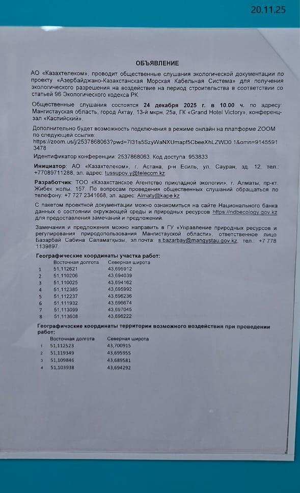 4. Повестка дня общественных слушаний: Проект «Азербайджано-Казахстанская Морская Кабельная Система» (Azerbaijan-Kazakhstan Sea Cable System/ Әзірбайжан-Қазақстан Теңіз Кәбіл Жүйесі), предусматривающий прокладку подводного оптоволоконного кабеля по дну Каспийского моря от г. Сумгаит (Азербайджан) до г. Акта (Казахстан) - это стратегический международный проект, реализуемый АО "Казахтелеком" совместно с ООО "Azertelecom Int.". Проект реализуется в соответствии с Соглашением между Правительством Республики Казахстан и Правительством Азербайджанской Республики об организации содействия в совместном строительстве, владении и пользовании волоконно-оптических линий связи по дну Каспийского моря по маршруту Казахстан-Азербайджан (утверждено Постановлением Правительства Республики Казахстан от 17 мая 2019 года № 295). Новая линия связи будет обладать пропускной способностью не менее 400 Тбит/с, что обеспечит высокоскоростную передачу данных и создаст важный телекоммуникационный мост между Азией и Европой. Трасса волоконно-оптического кабеля проходит по дну Каспийского моря от срединной линии разграничения участков дна моря с Азербайджаном до берегового колодца (BMH) на суше, в районе г. Актау. Участок трассы кабеля в прибрежной зоне расположен в пределах зоны влияния сгонно-нагонных колебаний уровня Каспийского моря. Наземный участок трассы кабеля и подземного бетонного колодца/ берегового колодца (BMH) расположен в границах городской администрации Актау. Ближайшая населенная территория/жилая зона города Актау расположена на расстоянии 1600 метров южнее от границы участка запланированных работ. Строительные работы планируются в период с февраля по сентябрь 2026 года, в общей сложности не более 7 месяцев. Строительные работы на море проводятся в виде укладки на дно волоконно-оптического кабеля с помощью судна-кабелеукладчика. Предполагаемая длина судна-кабелеукладчика составит 80 м, а грузоподъемность - 900 тонн. На данном участке от границы с Азербайджаном до глубин выше 15 м укладка кабеля осуществляется на поверхность дна. Использование вспомогательных элементов не требуется. Изъятие и перемещение грунта не осуществляется. Строительные работы в прибрежной зоне проводятся с заглублением кабеля в грунт следующим образом: а) прокладка траншеи на участке трассы от подземного бетонного колодца BMH до точки выхода на берег (LP) будет осуществляться с использованием экскаватора. Параметры следующие: ширина примерно 5 м, глубина 2 м, предполагаемая длина траншеи составляет около 360 м. По завершению работ участок будет восстановлен, почвенно-растительный покров будет восстановлен, подводный кабель с трубами AP (предполагаемая общая ширина 10 см) будет зарыт под землей. б) прокладка кабеля от точки выхода на берег на расстоянии 1000м в сторону моря вдоль маршрута – осуществляется бестраншейным методом, с помощью горизонтально-направленного бурения (ГНБ). Для ГНБ будет применяться сверлильный станок ГНБ. Изъятие и перемещение грунта осуществляется в соответствии с требованиями законодательства РК с привлечением специализированных компаний. На остальной части прибрежной зоны от 1000м до 2500м вдоль трассы в сторону моря – кабель укладывается на морское дно. Изъятие и перемещение грунта не осуществляется. Строительство подземного бетонного колодца BMH на берегу буд