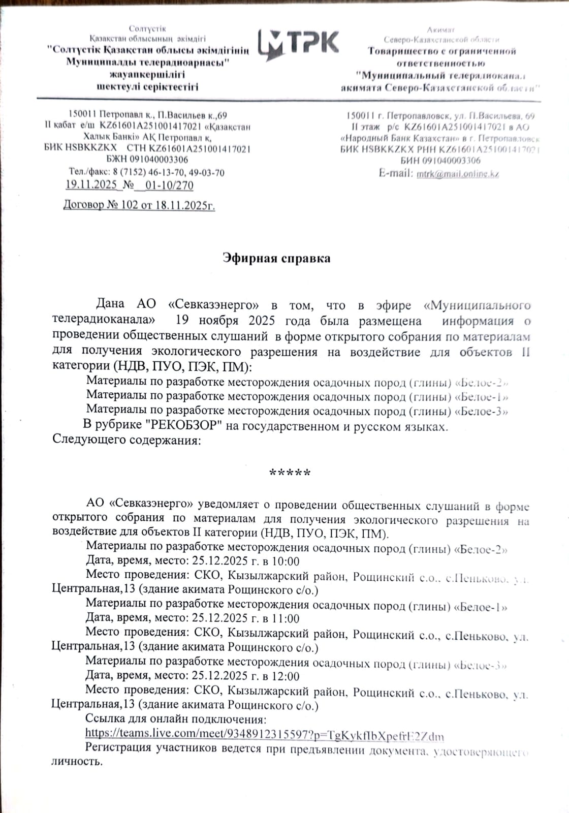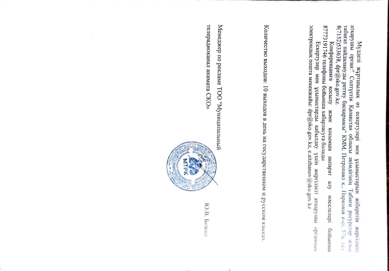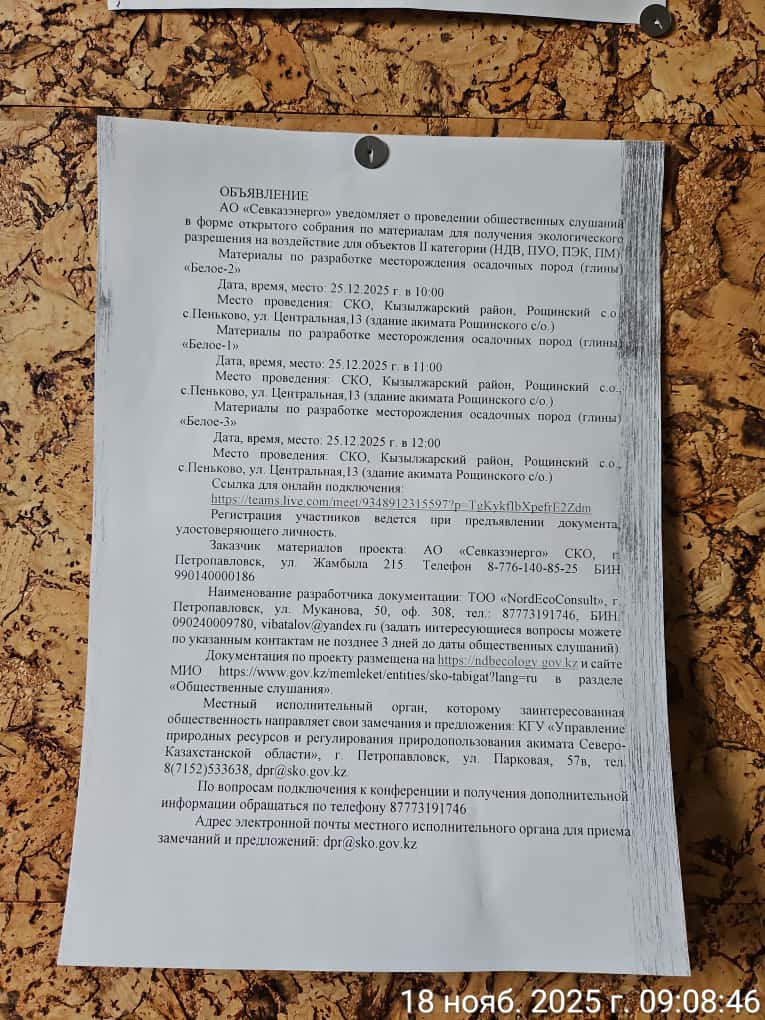 3. Общественные слушания организованны: Управление природных ресурсов и регулирования природопользования Северо-Казахстанской области, e.aitzhanov@sko.gov.kz,