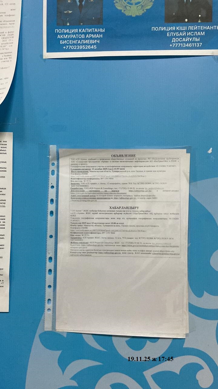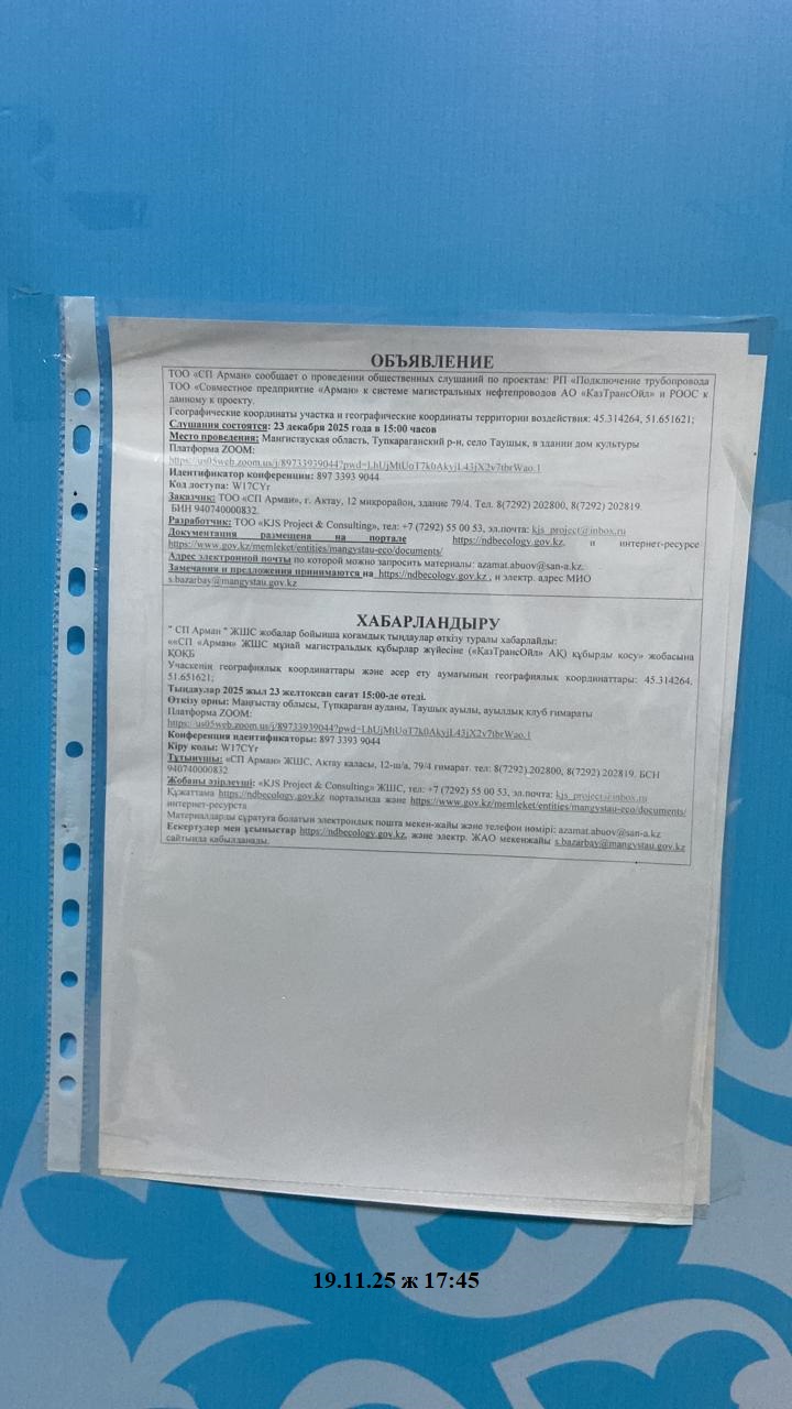 3. Общественные слушания организованны: Управление природных ресурсов и регулирования природопользования Мангистауской области, s.bazarbay@mangystau.gov.kz,