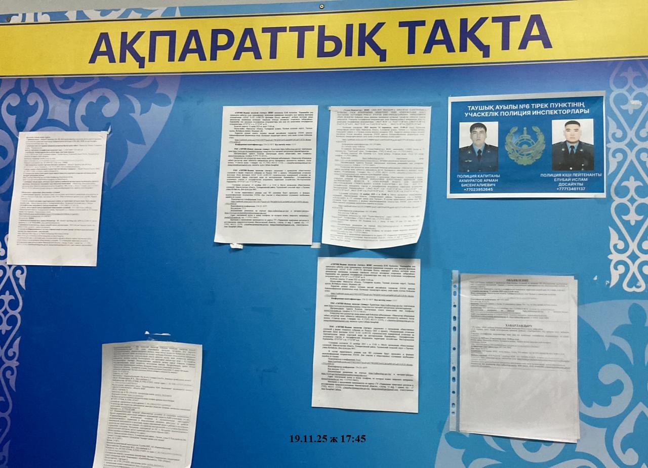 6.3. расположение мест, специально предназначенных для Размещения печатных объявлений (доски объявлений): Доска объявлений здания Акимата