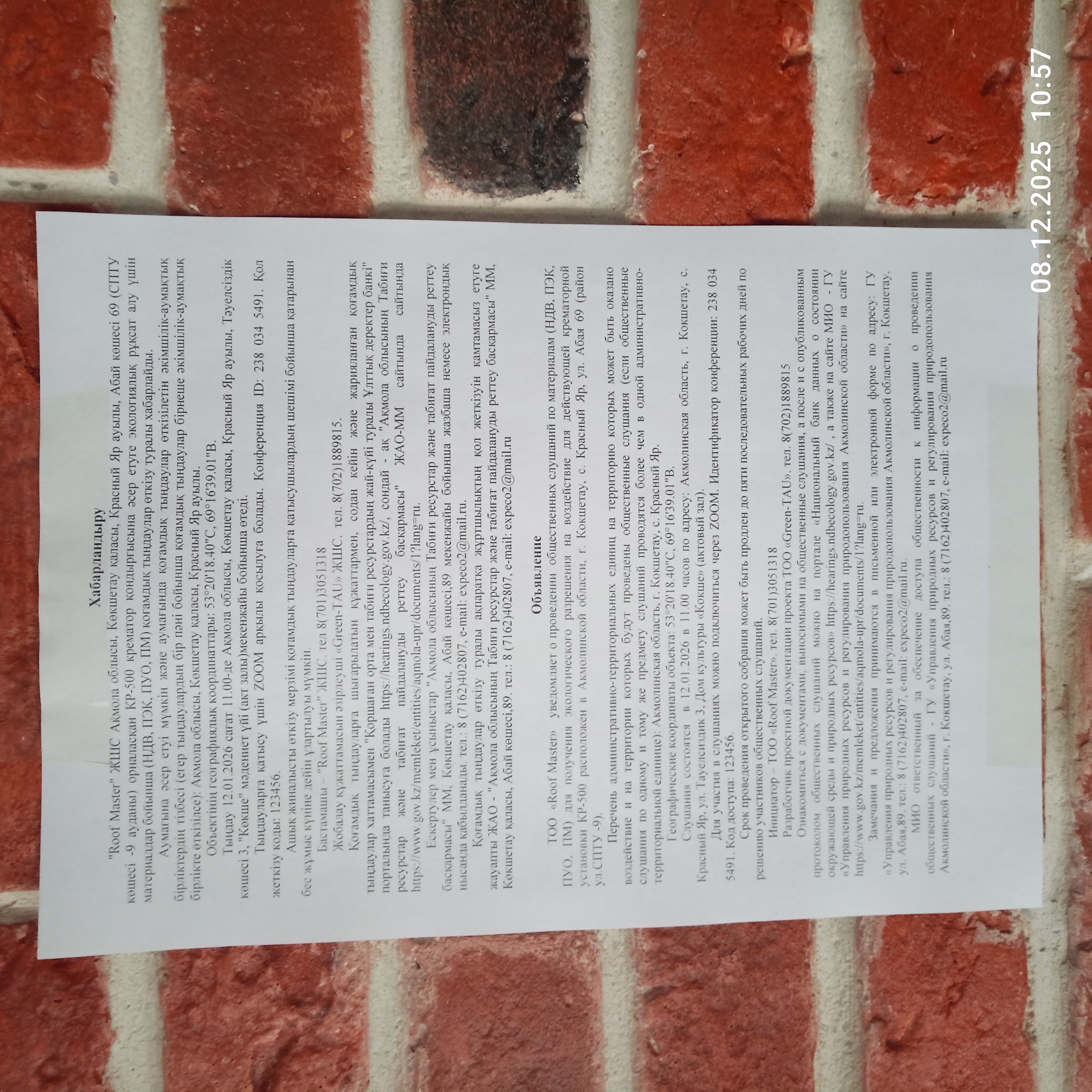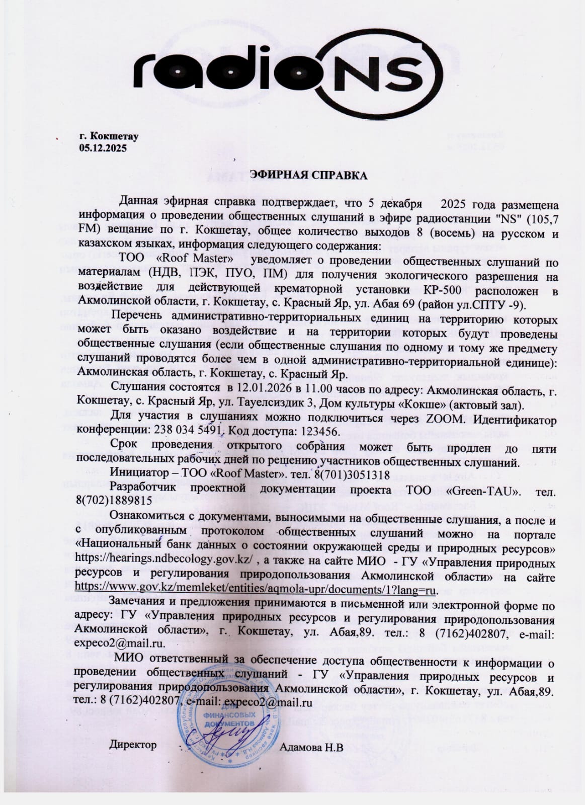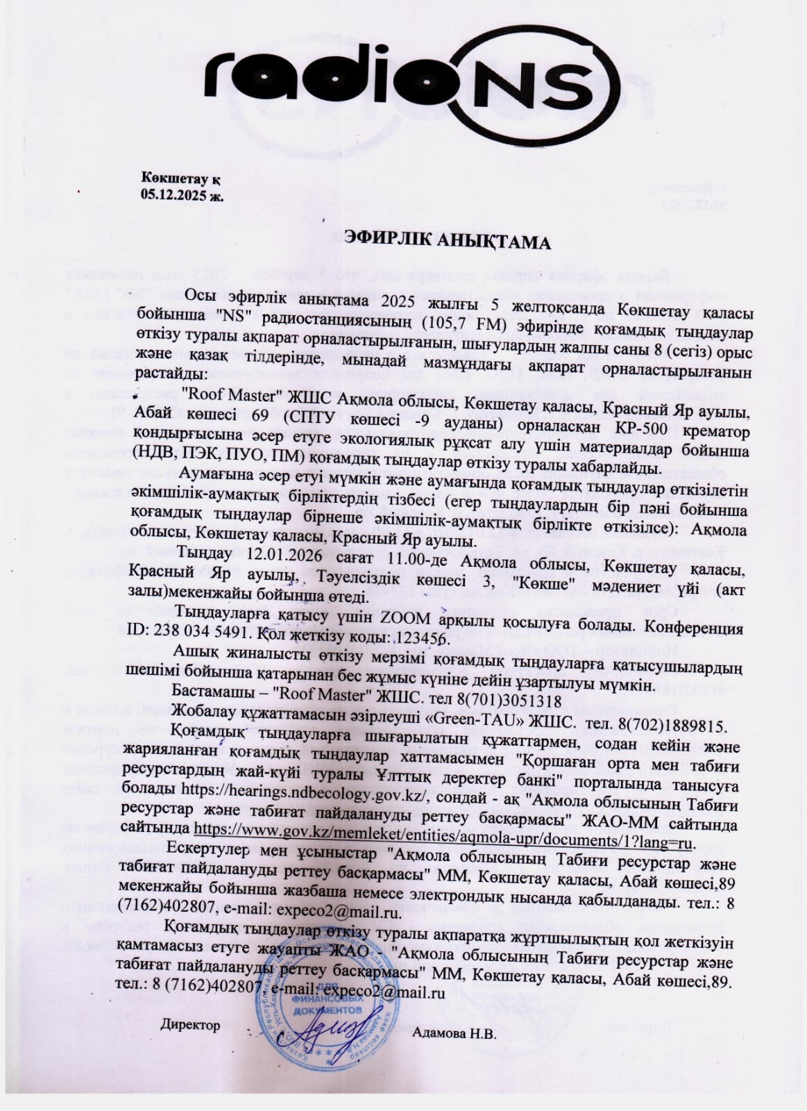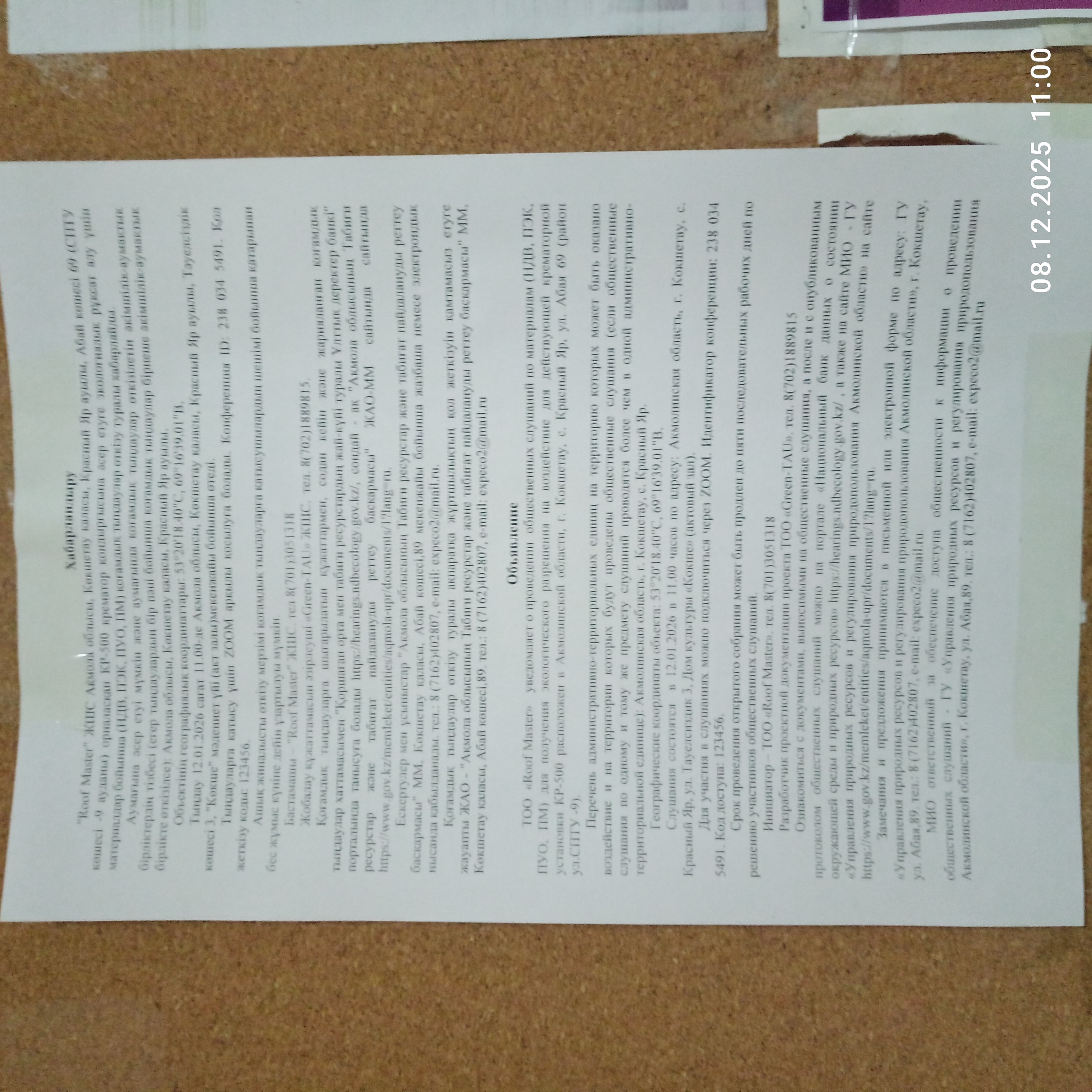 3. Общественные слушания организованны: Управление природных ресурсов и регулирования природопользования Акмолинской области, expeco@mail.ru,