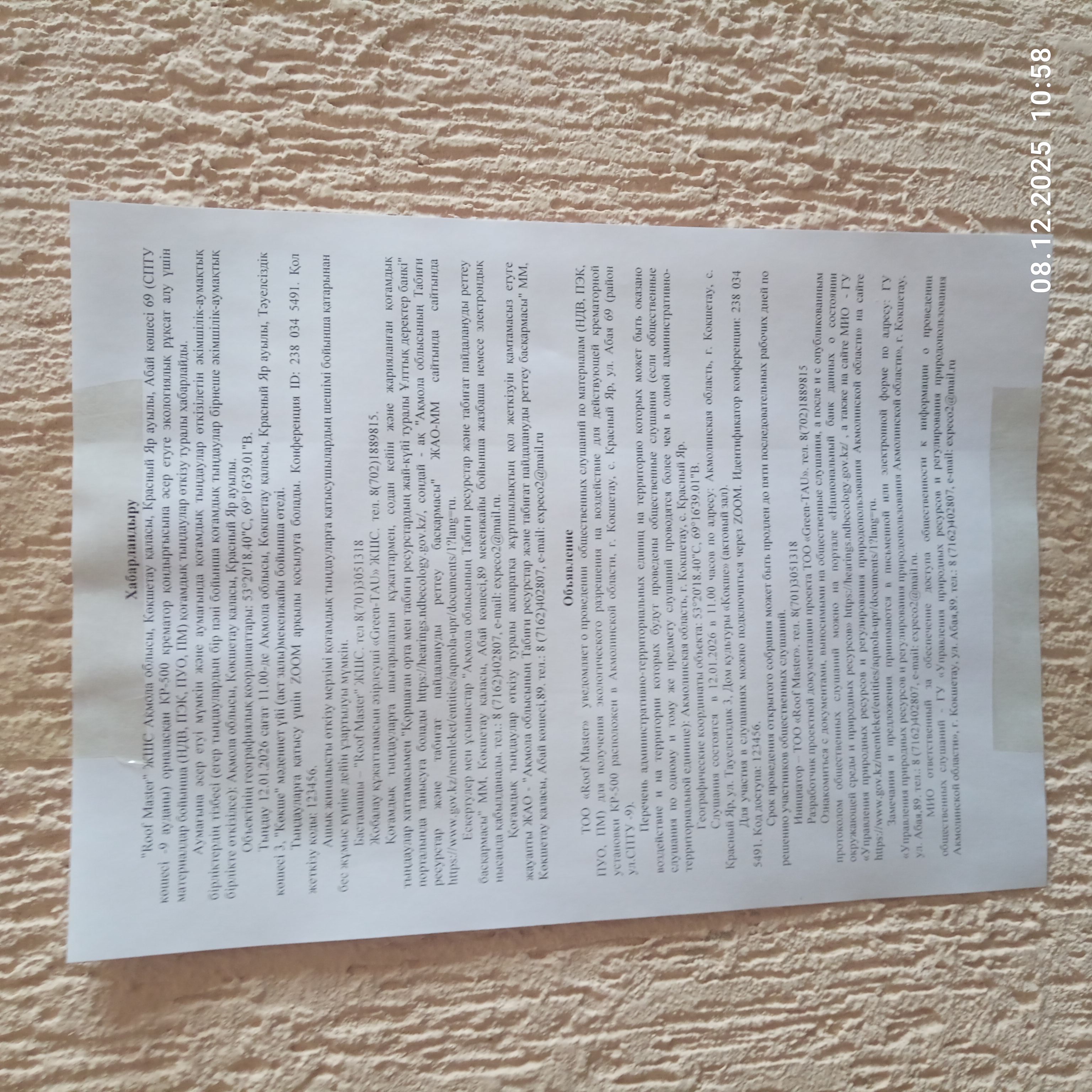 6. Объявление о проведении общественных слушаний на казахском и русском языках будет распространено следующими способами: