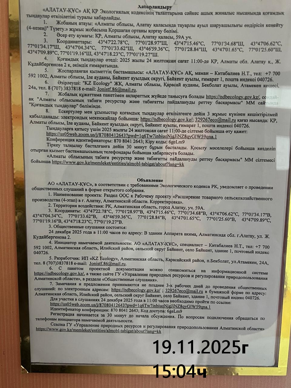 1.4. Описание для подключения к онлайн трансляции при прохождении общественного слушания: Идентификатор конференции: 870 8041 2643; Код доступа: 6geLm9