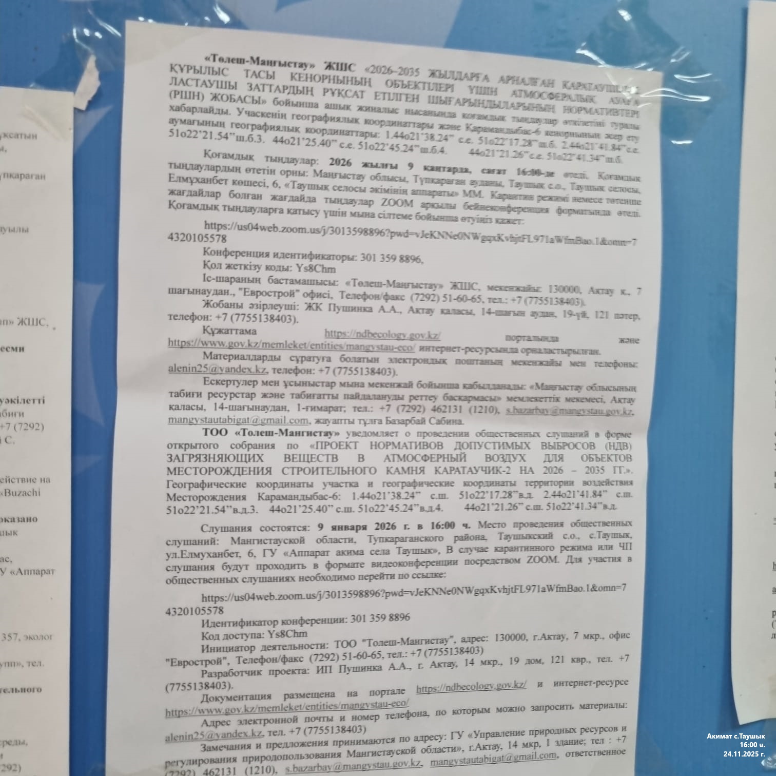 3. Общественные слушания организованны: Управление природных ресурсов и регулирования природопользования Мангистауской области, s.bazarbay@mangystau.gov.kz,