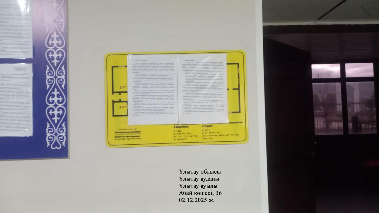 6.3. расположение мест, специально предназначенных для Размещения печатных объявлений (доски объявлений): Область Ұлытау, Улытауский район, Улытауский с.о, с.Улытау, ул. Абая 36