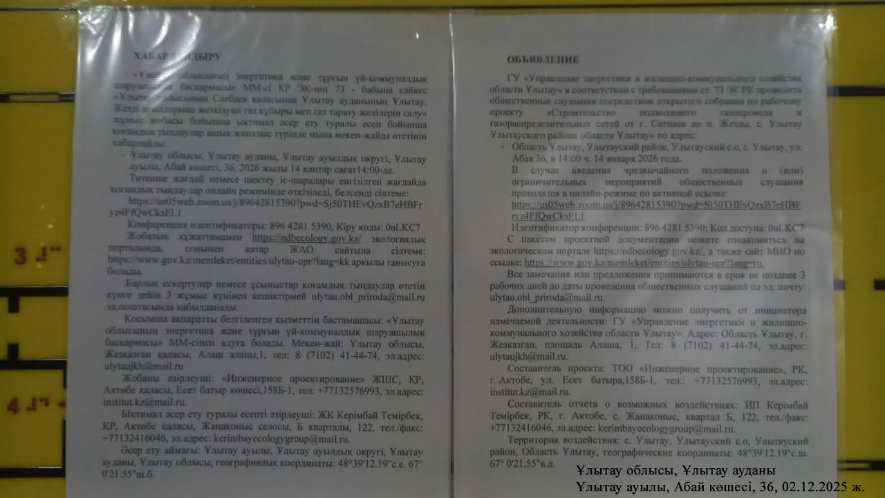 4. Повестка дня общественных слушаний: Рабочим проектом «Строительство подводящего газопровода и газораспределительных сетей от г.Сатпаев до п. Жезды, с. Улытау Улытауского района области Ұлытау» предусматривается строительство газопровода в п. Жезды, состоящий из газопроводов высокого давления 1,2 Мпа – 44.25 км; среднего давления 0,3 Мпа – 6.514 км; низкого давления 0,003 МПа – 23.882 км. Общей протяженностью – 74.646 км; в с. Ұлытау: состоящий из газопроводов высокого давления 1,2 Мпа – 71.105 км; среднего давления 0,3 Мпа – 8.916 км; низкого давления 0,003 МПа – 20.755 км. Общей протяженностью – 100.776 км. Всего протяженность газопровода: 175.422 км. В п. Жезды: Количество газифицируемых жилых домов – 495 шт. Количество газифицируемых соц.объектов – 29 шт. В с. Ұлытау: Количество газифицируемых жилых домов – 466 шт. Количество газифицируемых соц.объектов – 37 шт. Протяженность трассы (трубопроводов) в п. Жезды: Газопровод высокого давления I-категории, Рраб.=1,2 МПа, ø426×7,0мм из стали марки 20, (с заводской изоляцией весьма усиленного типа), по ГОСТ 10704-91 в надземном исполнении протяженностью - L=50 м и в подземном исполнении из полиэтиленовых труб СТ РК ГОСТ Р 50838-2011 (ГОСТ Р 50838-2011) ПЭ100 SDR-9 Ø400х44,7мм, протяжённостью - L=44200 м. Внутриплощадочные сети газопровода среднего давления выполнено в надземном исполнении (на опорах) из стальных труб ø219×6,0, ø57×3,0 по ГОСТ 10704-91 протяженностью - L=94 м и в подземном исполнении из полиэтиленовых труб СТ РК ГОСТ Р 50838-2011 (ГОСТ Р 50838-2011) ПЭ100 SDR-11, ø200×11,9мм, ø160×9,5мм, ø110×6,6мм, ø63×3,8мм, протяженностью - L=6420 м. Внутриплощадочные сети газопровода низкого давления прокладывается в надземном исполнении (на опорах) из стальных труб ø159×6.0, ø57×3.0 по ГОСТ 10704-91, ø32×2,8, по ГОСТ 3262-75, протяженностью - L=1542 м и в подземном исполнении из полиэтиленовых труб СТ РК ИСО 4437-2004 (ГОСТ Р 50838-2011) ПЭ100 SDR-17, ø160×9,5мм, ø110×6,6мм, ø90×5,4мм, ø63×3,8мм, ø40×3,7мм. протяженностью - L=22340,0 м. Общая протяженность газопровода – 74.646 км. Предусматривается установка пункта газорегуляторные блочные ПГБ-16-2ВУ-1, с узлом учета газа с газовым обогревом котлом КСГ-10 и газорегуляторного пункта шкафной ГРПШ-07-2У-1 – 7 шт. Протяженность трассы (трубопроводов) в с. Ұлытау: Газопровод высокого давления I-категории, Рраб.=1,2 МПа, ø426×7,0мм из стали марки 20, (с заводской изоляцией весьма усиленного типа), по ГОСТ 10704-91 в надземном исполнении протяженностью - L=105 м и в подземном исполнении из полиэтиленовых труб СТ РК ГОСТ Р 50838-2011 (ГОСТ Р 50838-2011) ПЭ100 SDR-9 ø400×44,7мм, протяжённостью - L=71000 м. Внутриплощадочные сети газопровода среднего давления выполнено в надземном исполнении (на опорах) из стальных труб ø219×6,0, ø57×3,0 по ГОСТ 10704-91 протяженностью - L=121 м и в подземном исполнении из полиэтиленовых труб СТ РК ГОСТ Р 50838-2011 (ГОСТ Р 50838-2011) ПЭ100 SDR-11, ø200×11,9мм, ø160×9,5мм, ø110×6,6мм, ø63×3,8мм, протяженностью - L=8795 м. Внутриплощадочные сети газопровода низкого давления прокладывается в надземном исполнении (на опорах) из стальных труб ø159×6.0, ø57×3.0 по ГОСТ 10704-91, ø32×2,8, по ГОСТ 3262-75, протяженностью - L=1410 м и в подземном исполнении из полиэтиленовых труб СТ РК ИСО 4437-2004 (ГОСТ Р 50838-2011) ПЭ100 SDR-17, ø160×9,5мм, ø110×6,6мм, ø90×5,4мм, ø63×3,8мм, ø40×3,7мм. протяженностью - L=19345,0 м. Общая протяженность газопровода – 100.776 км. Всего длина газопровода составляет 175.422 км. Предусматривается установка пункта газорегуляторные блочные ПГБ-16-2ВУ-1, с узлом учета газа с газовым обогревом котлом КСГ-10 и га