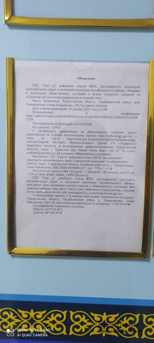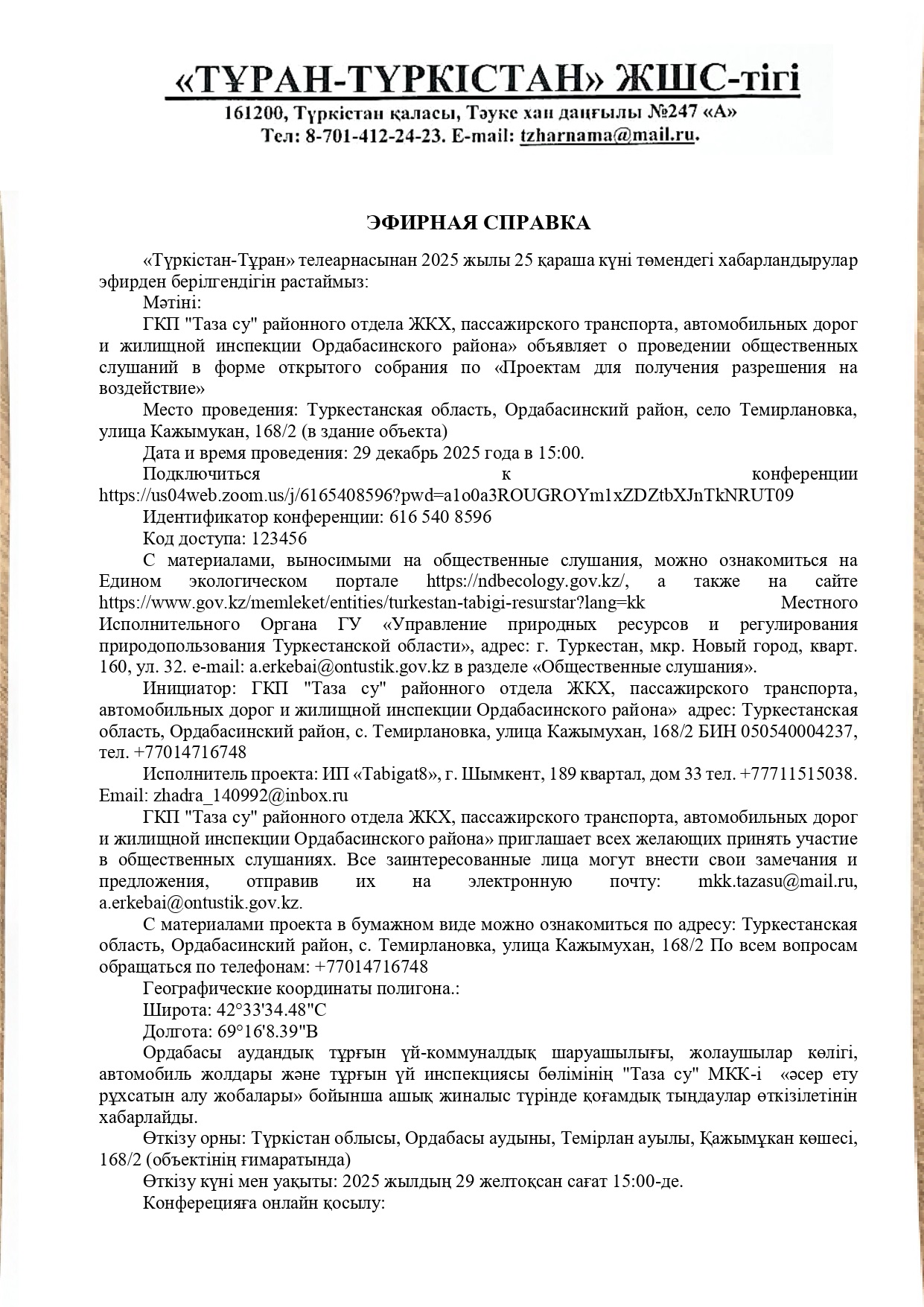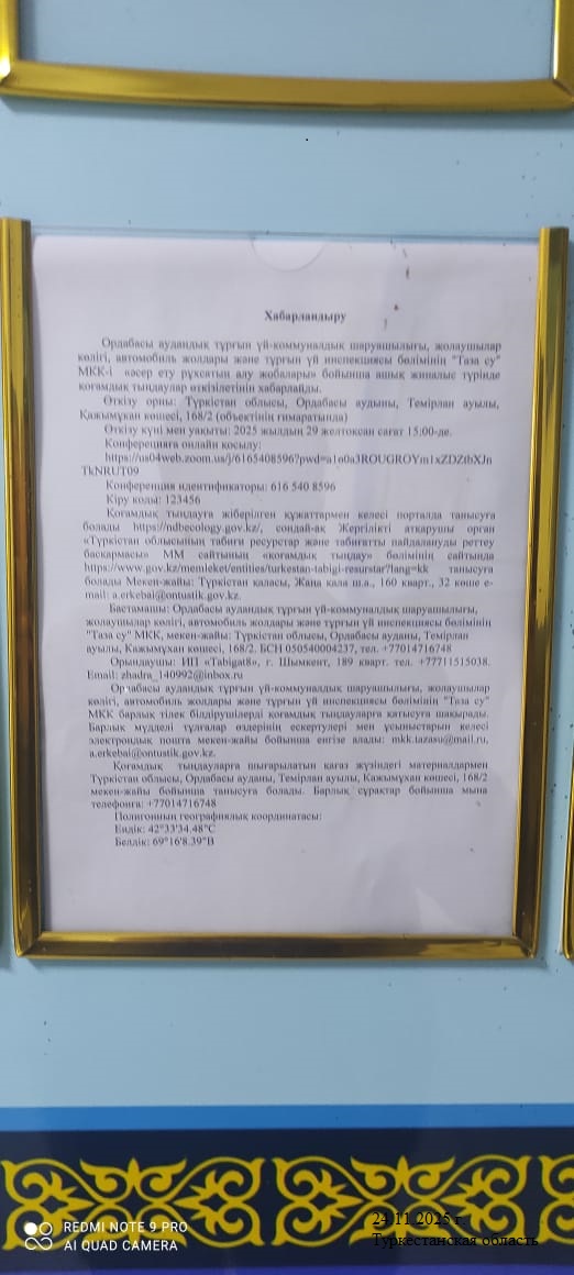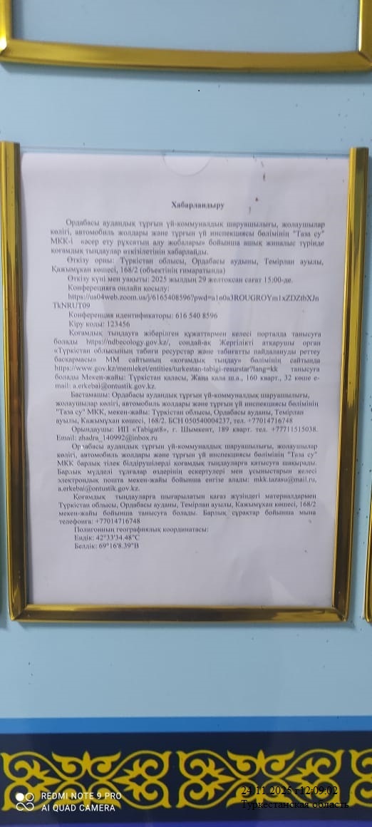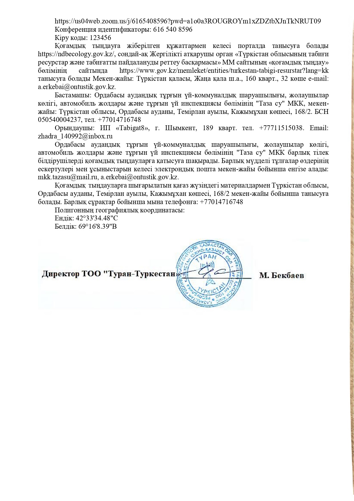 3. Общественные слушания организованны: Управление природных ресурсов и регулирования природопользования Туркестанской области, a.erkebai@ontustik.gov.kz,