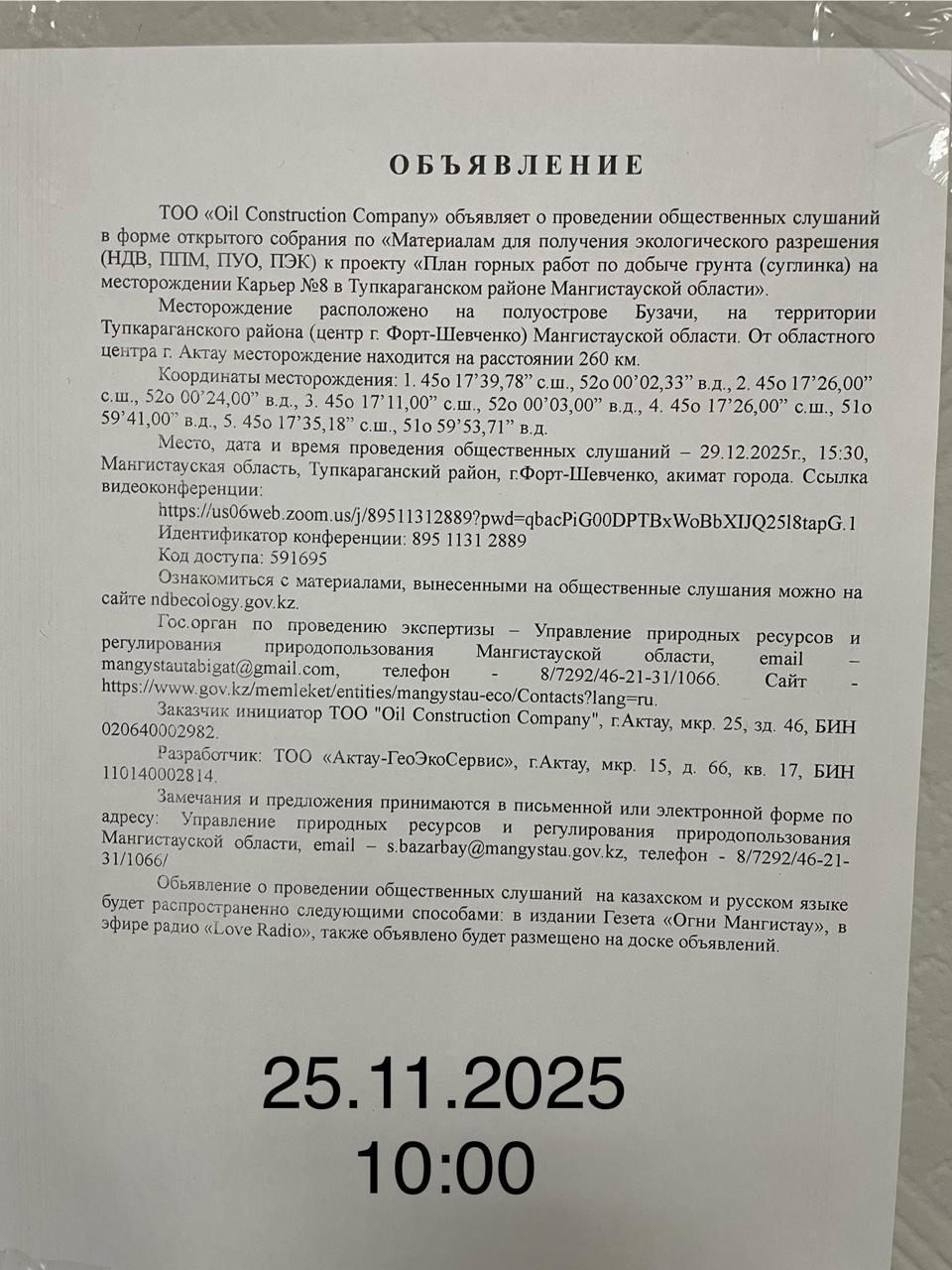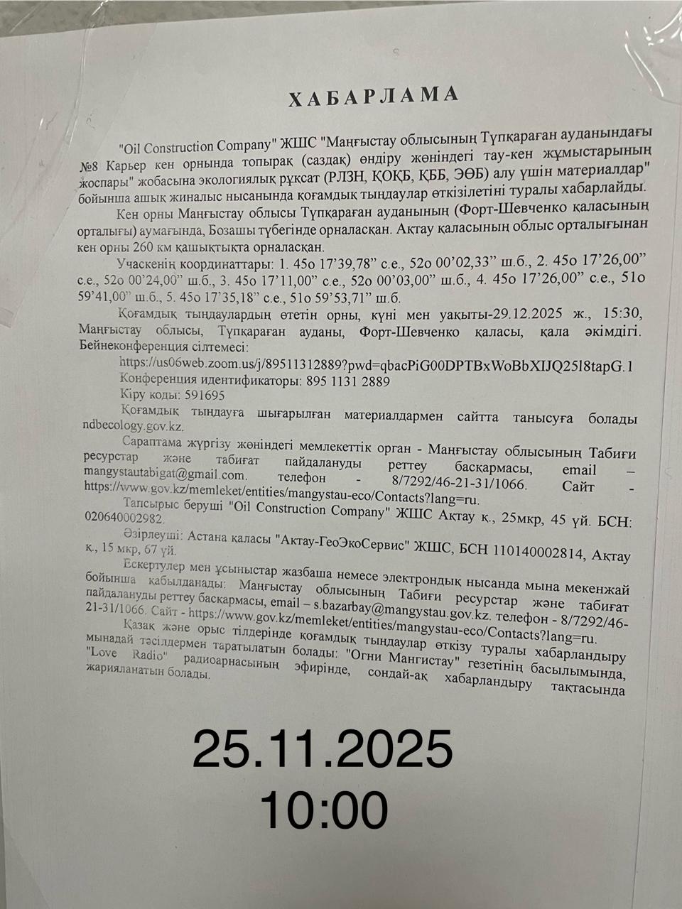 4. Повестка дня общественных слушаний: Настоящим Планом предусматривается производство горных работ по добыче грунта (суглинка) на месторождении Карьер №8 в Тупкараганском районе Мангистауской области. Заказчиком проекта является ТОО «Oil Construction Company», запрашивающее право на разработку грунта (суглинка) карьера. Содержание и форма плана приняты в соответствии с Техническим заданием Заказчика и действующими нормативными документами. Добываемое сырье - грунта (суглинка) будет использоваться для строительных работ в регионе. Срок эксплуатации карьера – 3 года (2025-2027 гг.). С 2005 года разработка месторождения велась по Рабочему проекту, составленному ТОО НПЦ «Мангистау-Геология» для ТОО «Oil Construction Company», согласованному в Государственных экспертных инстанциях. Проектируемые к отработке запасы находятся на Государственном балансе и их остаточное количество по состоянию на 01.10.2025 г., согласно отчетности ТОО «ОСС» составляет 644,274 тыс. м3 . На их отработку имеется Горный отвод площадью 0,4484 км2 (Акт за № ЗК/612 от 03.07.2009г.). По данному плану будет отработана часть запасов полезного ископаемого в объеме 425,21 тыс.м3 геологических запасов. С учетом потерь отрабатываемые эксплуатационные запасы составляют 420,0 тыс. м3. Остаточные запасы будут отработаны после пролонгации Контракта. Подключиться к конференции Zoom https://us06web.zoom.us/j/89511312889?pwd=qbacPiG00DPTBxWoBbXIJQ25l8tapG.1 Идентификатор конференции: 895 1131 2889 Код доступа: 591695