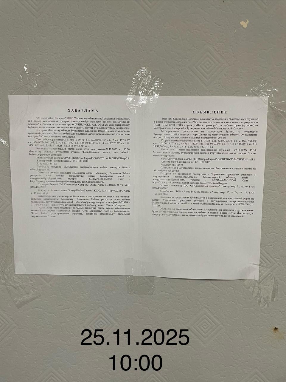 3. Общественные слушания организованны: Управление природных ресурсов и регулирования природопользования Мангистауской области, s.bazarbay@mangystau.gov.kz,