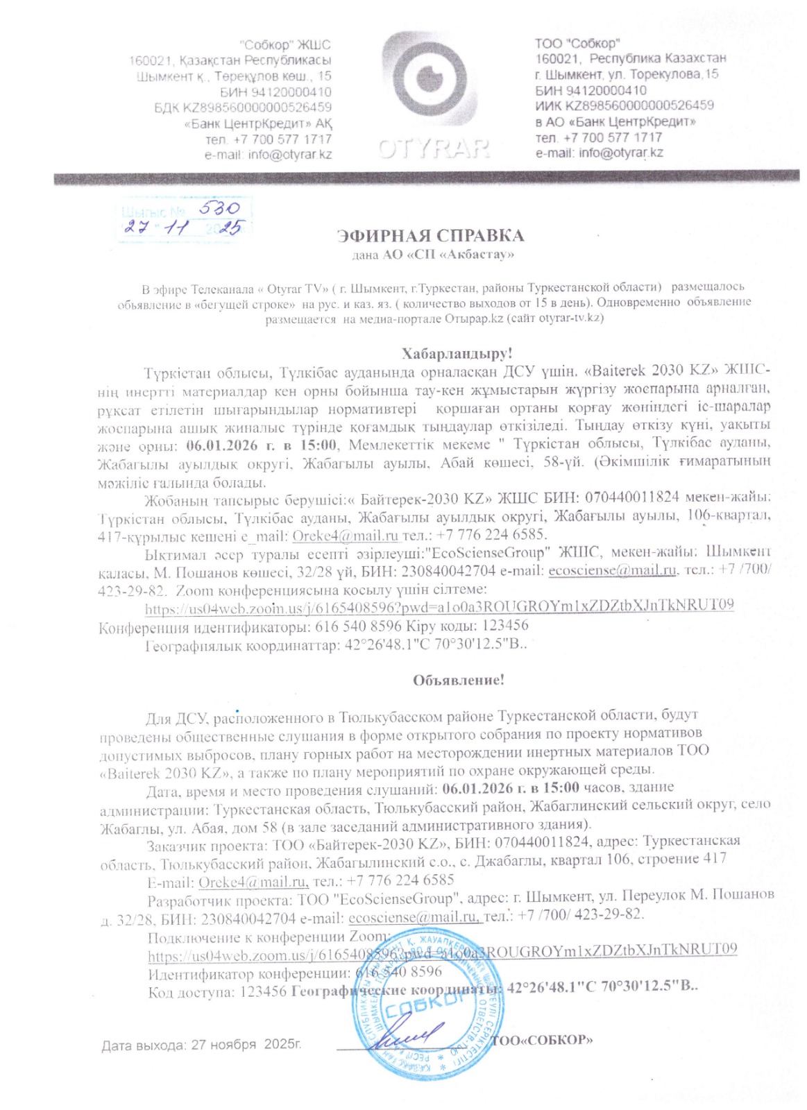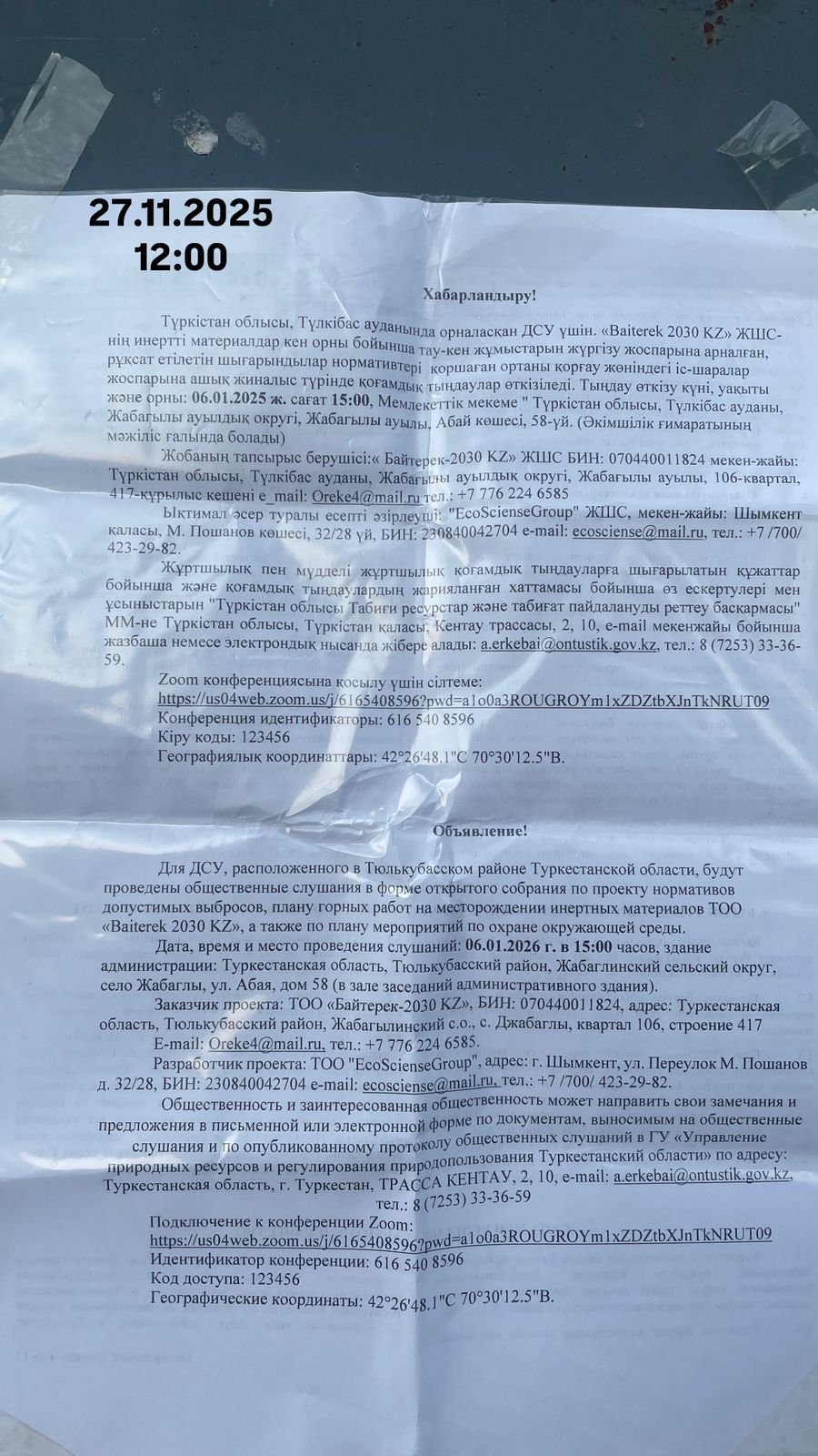 3. Общественные слушания организованны: Управление природных ресурсов и регулирования природопользования Туркестанской области, a.erkebai@ontustik.gov.kz,