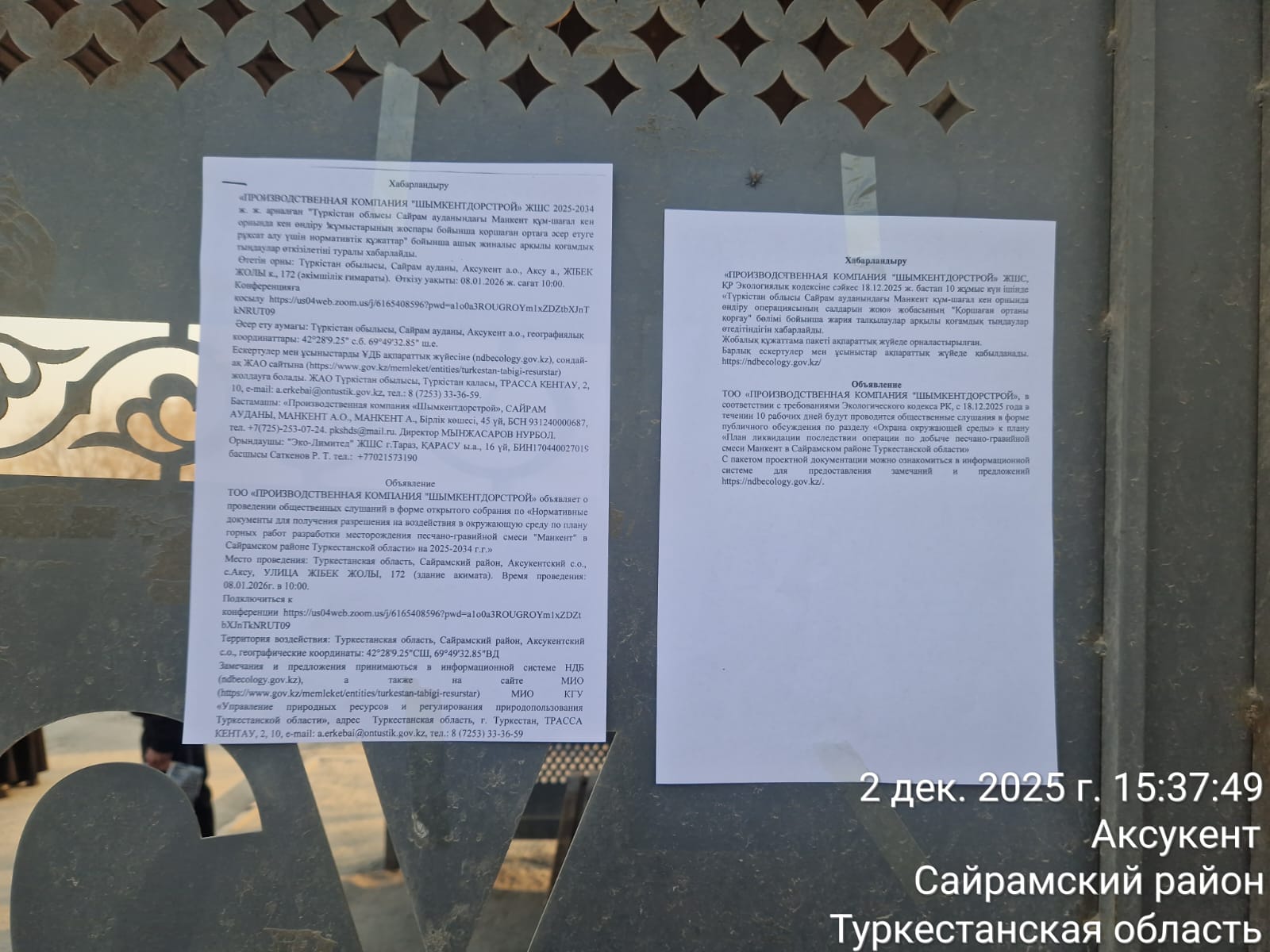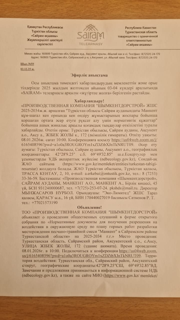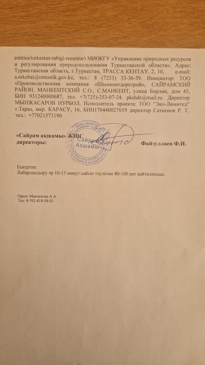 3. Общественные слушания организованны: Управление природных ресурсов и регулирования природопользования Туркестанской области, a.erkebai@ontustik.gov.kz,