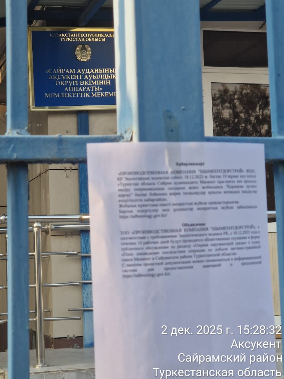 1.2. Место проведения: Туркестанская область, Сайрамский район, Аксукентский с.о., с.Аксу, УЛИЦА ЖІБЕК ЖОЛЫ, 172 (здание акимата)