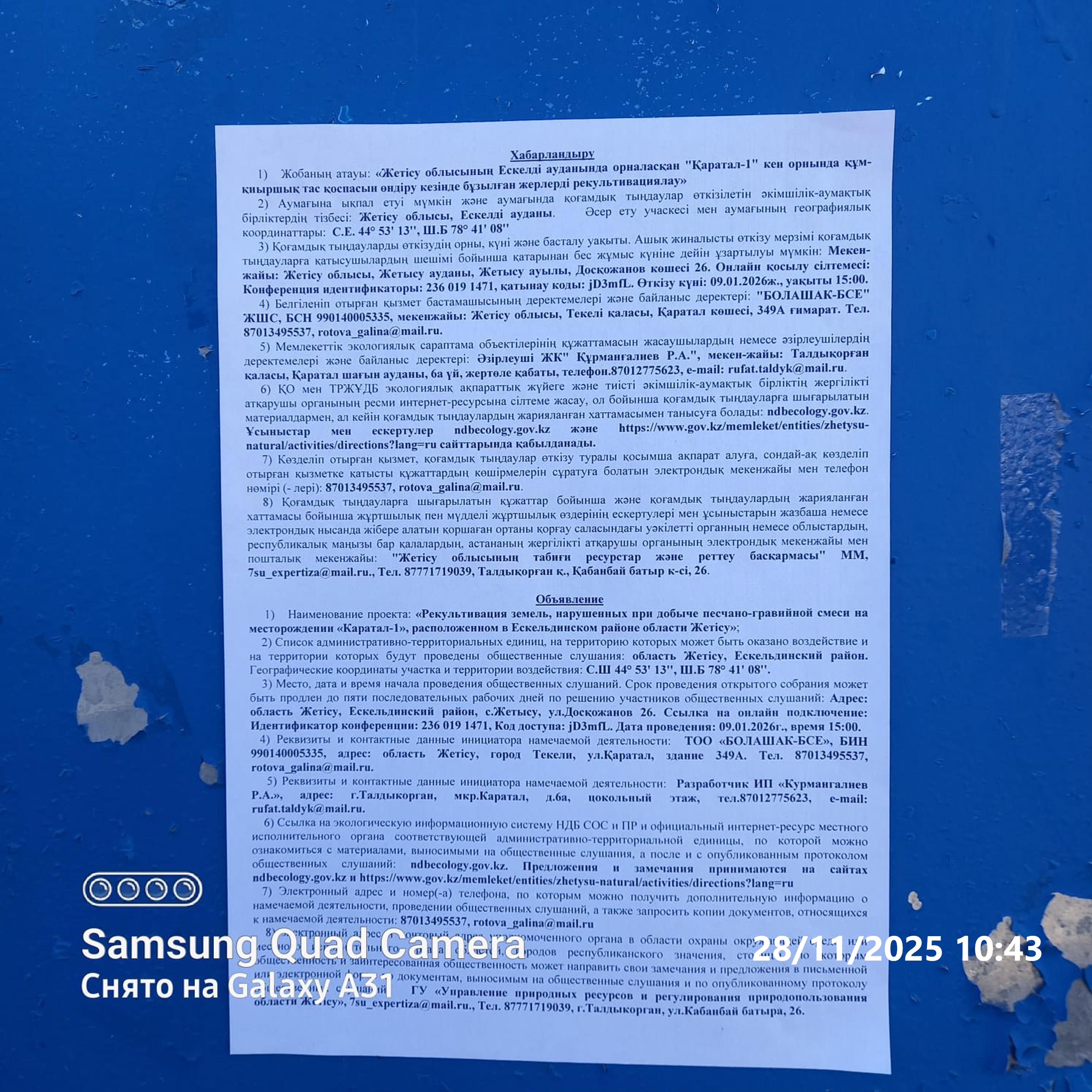 3. Общественные слушания организованны: Главный специалист УПР и ПР Жетысуйской области, priroda@zhetisu.gov.kz,