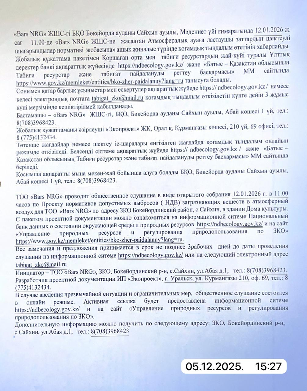 3. Общественные слушания организованны: Управление природных ресурсов и регулирования природопользования Западно-Казахстанской области, zko_forest@bko.gov.kz,