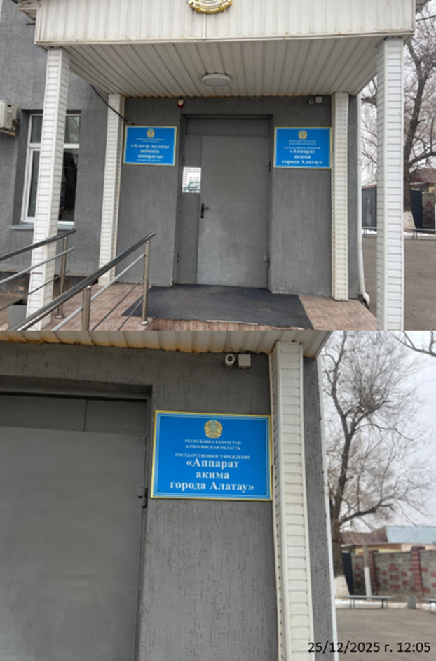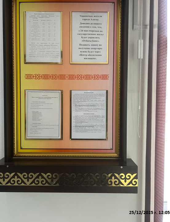 6.3. расположение мест, специально предназначенных для Размещения печатных объявлений (доски объявлений): ул. Ж. Кудайбергенова 2, ГУ Аппарат акима города Алатау, доска объявлений
