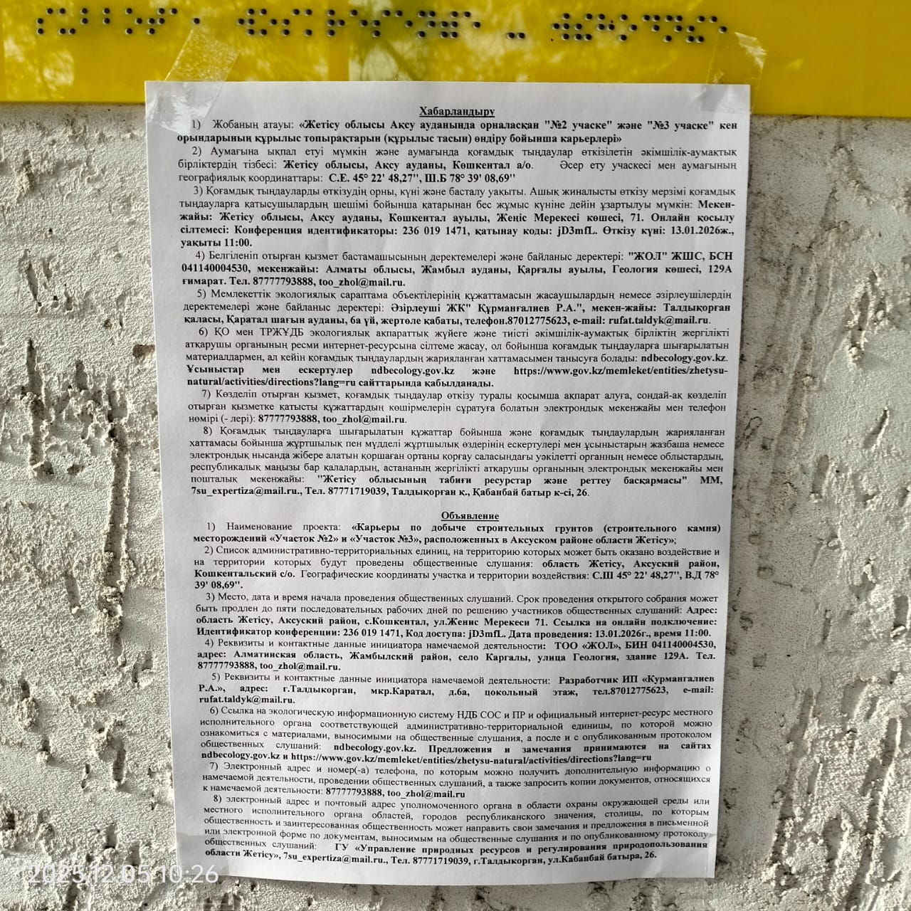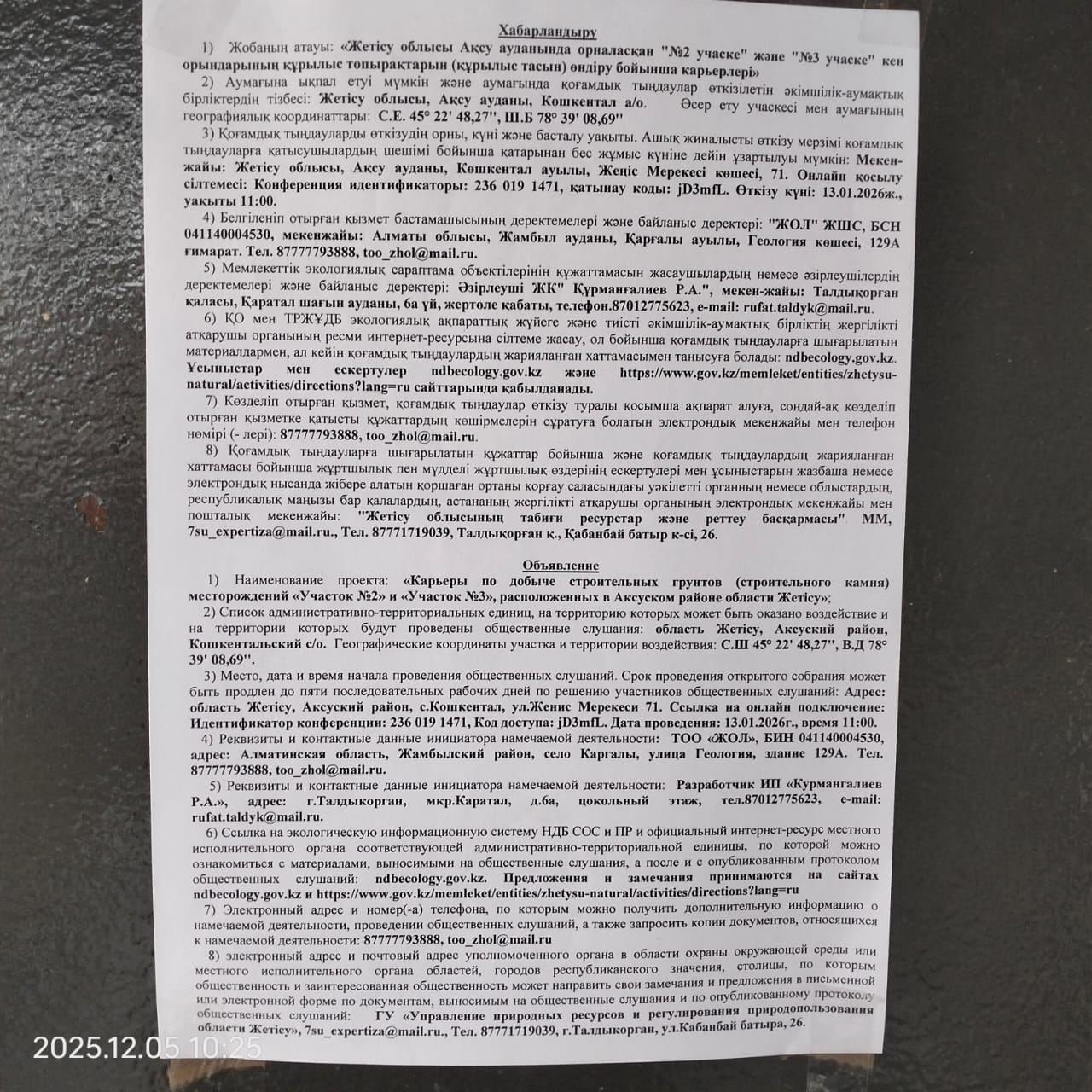3. Общественные слушания организованны: Главный специалист УПР и ПР Жетысуйской области, priroda@zhetisu.gov.kz,