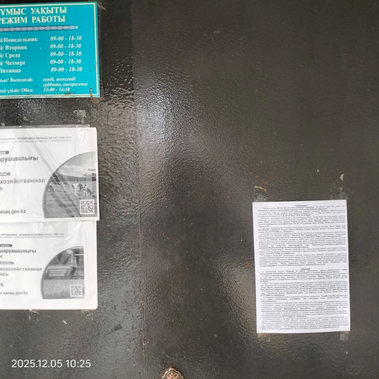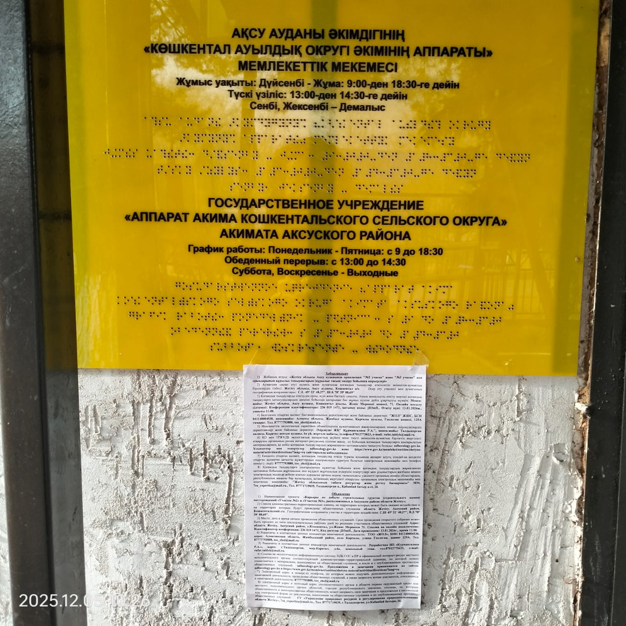6.3. расположение мест, специально предназначенных для Размещения печатных объявлений (доски объявлений): Доска объявлений Акимата