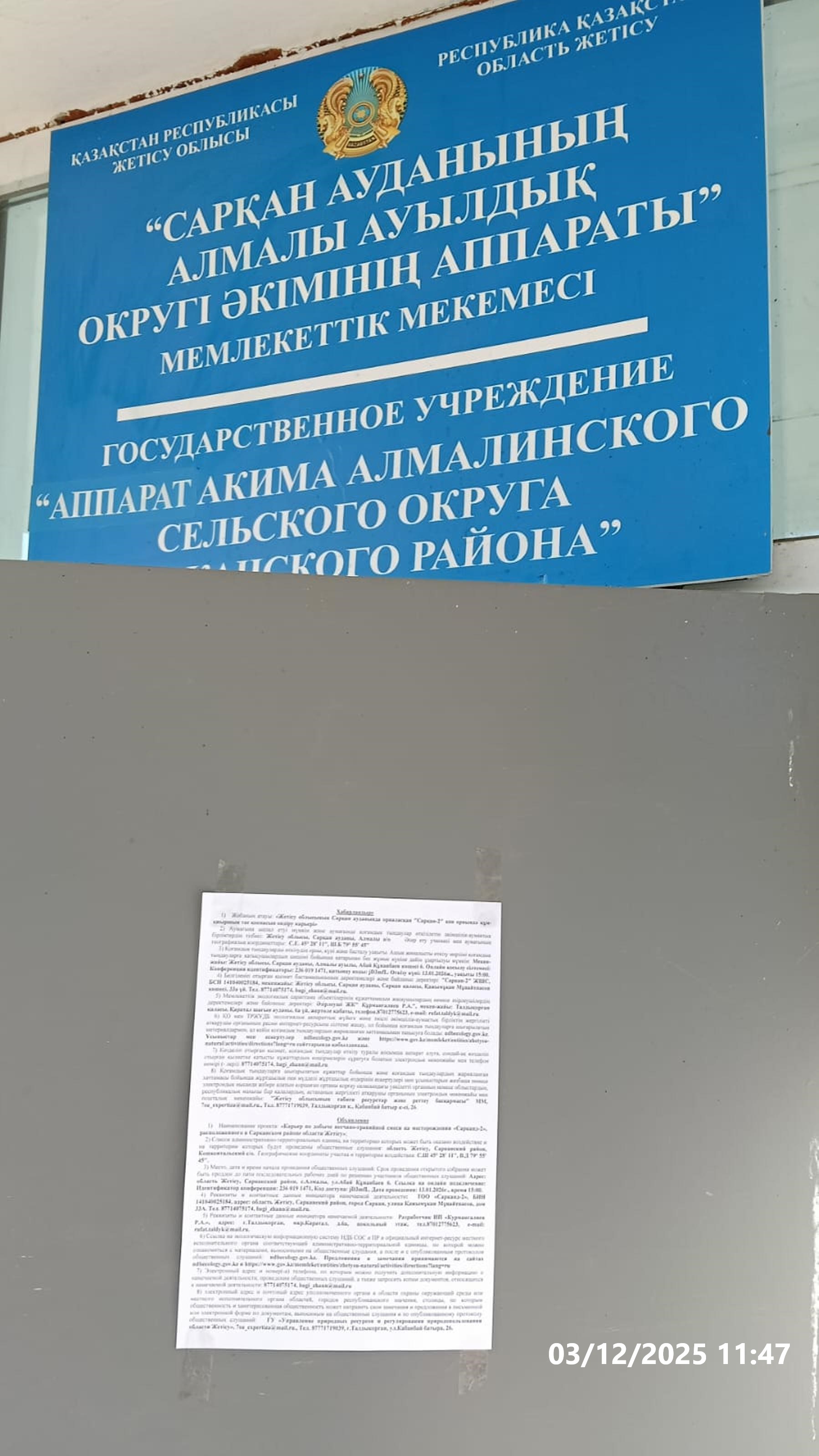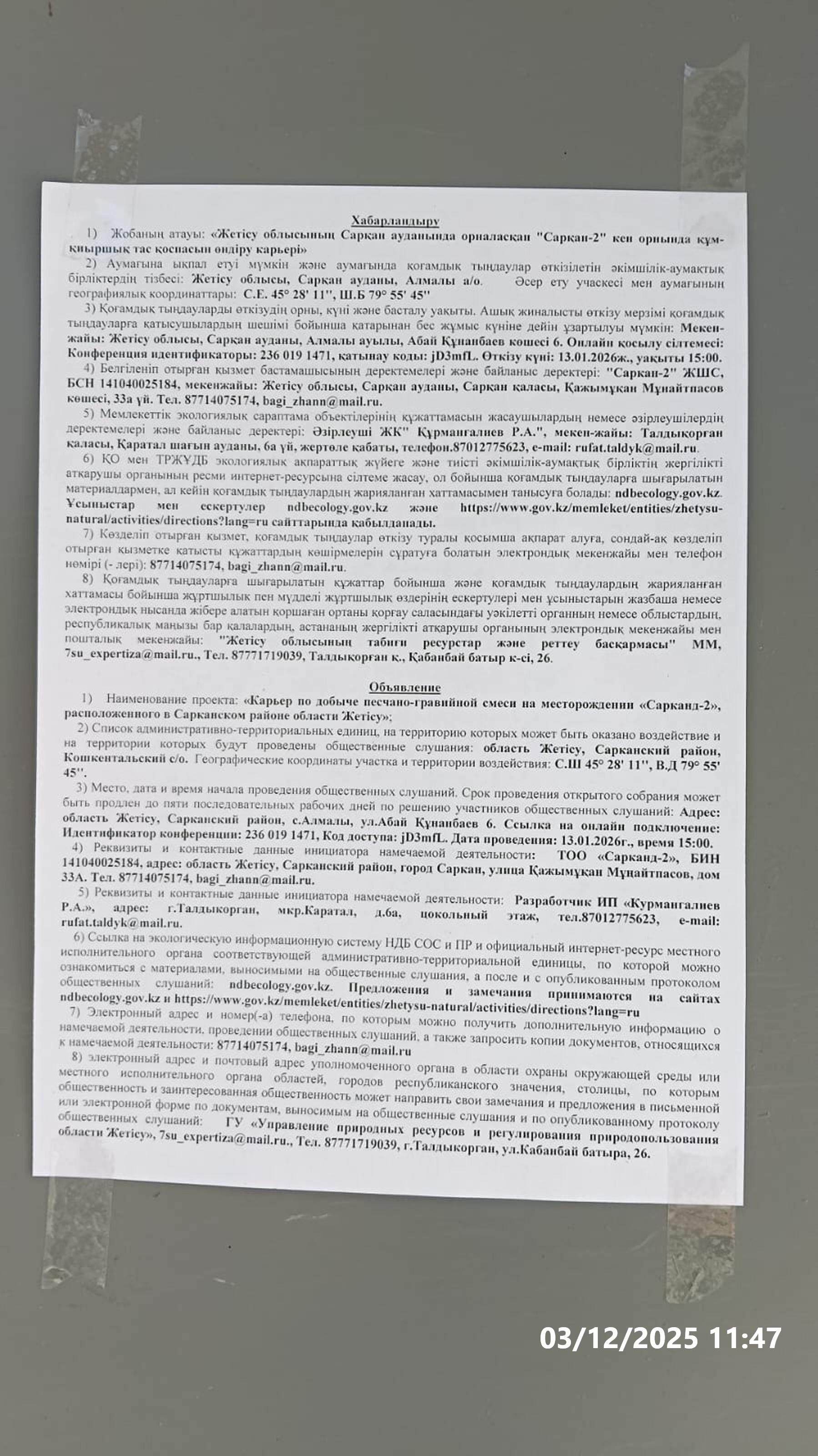 3. Общественные слушания организованны: Главный специалист УПР и ПР Жетысуйской области, priroda@zhetisu.gov.kz,