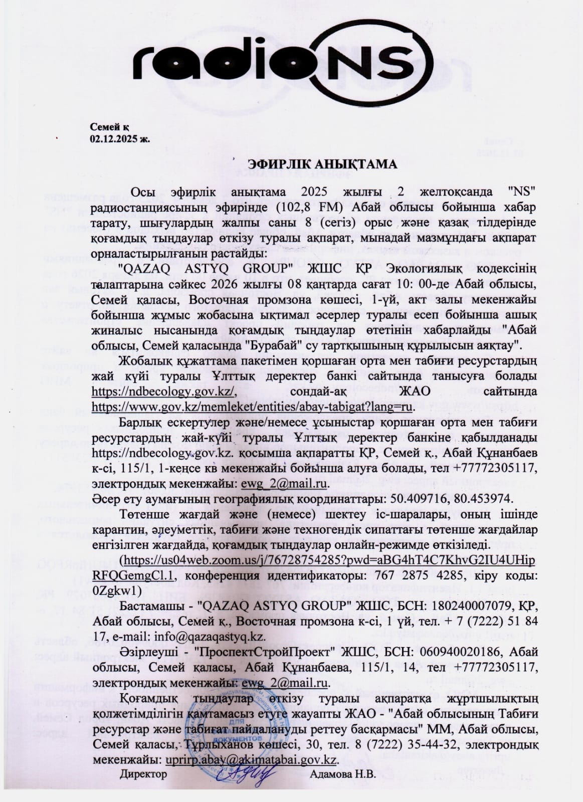 3. Общественные слушания организованны: Главный специалист УПР и ПР область Абай, prirodnyye_resursy_obl.abay@mail.ru,