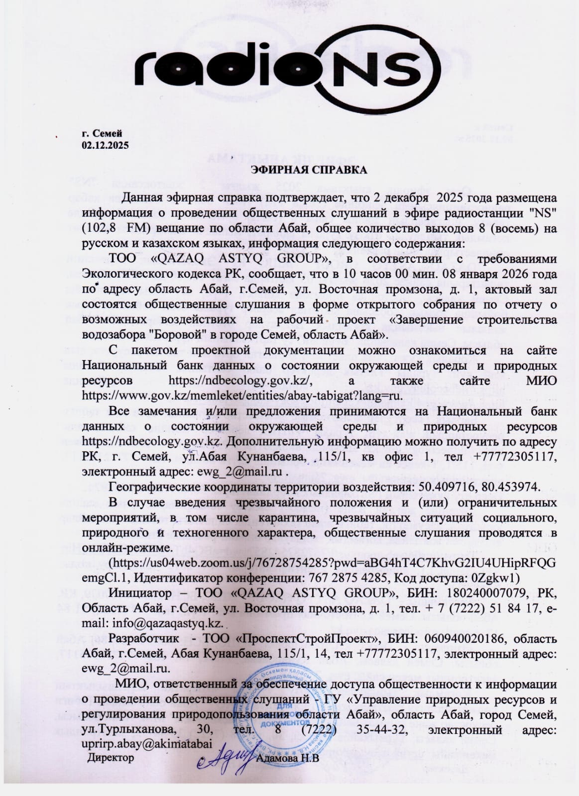 По проекту: ОТЧЕТ О ВОЗМОЖНЫХ ВОЗДЕЙСТВИЯХ на рабочий проект «Завершение строительства водозабора "Боровой" в городе Семей, область Абай»
