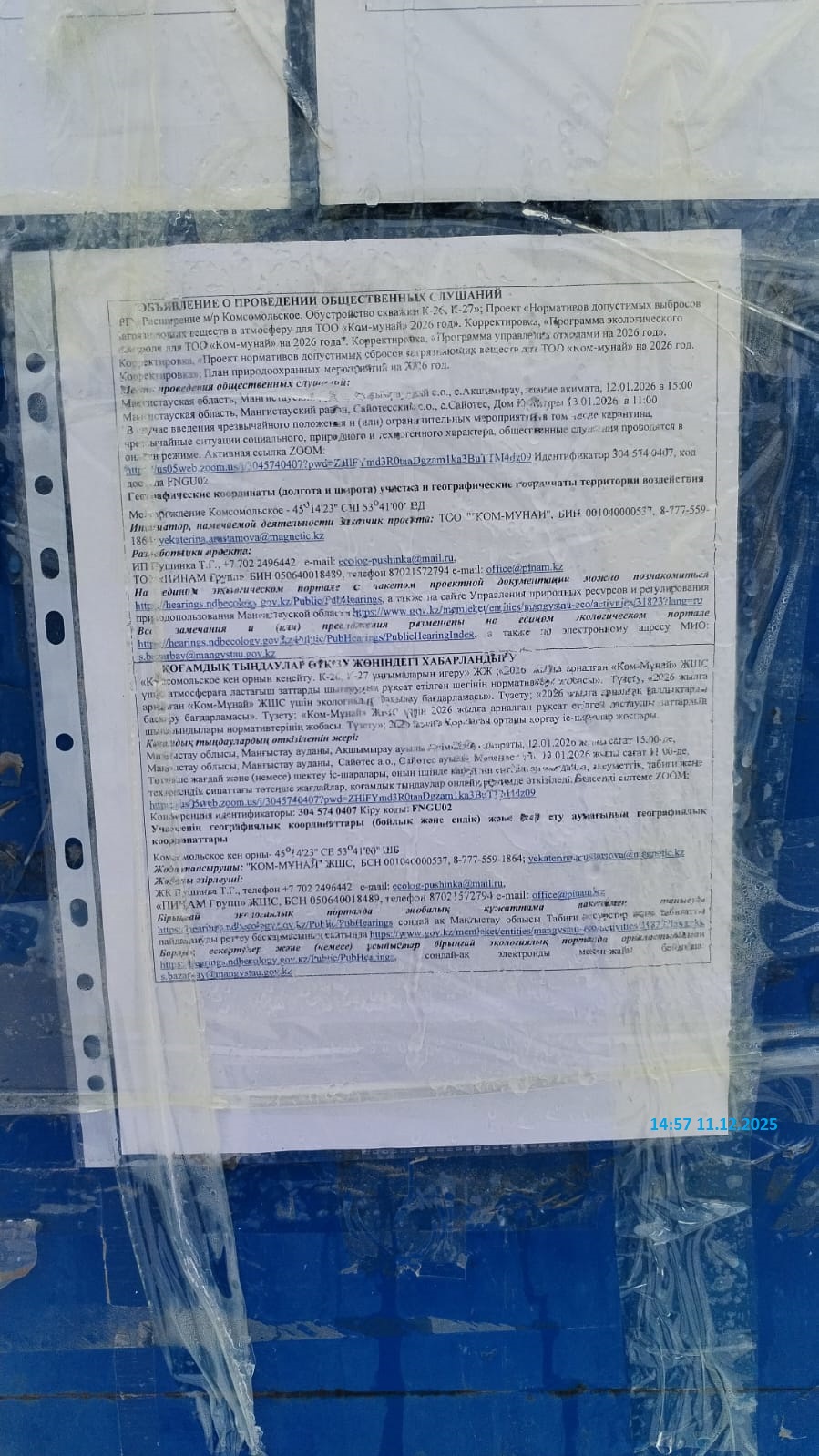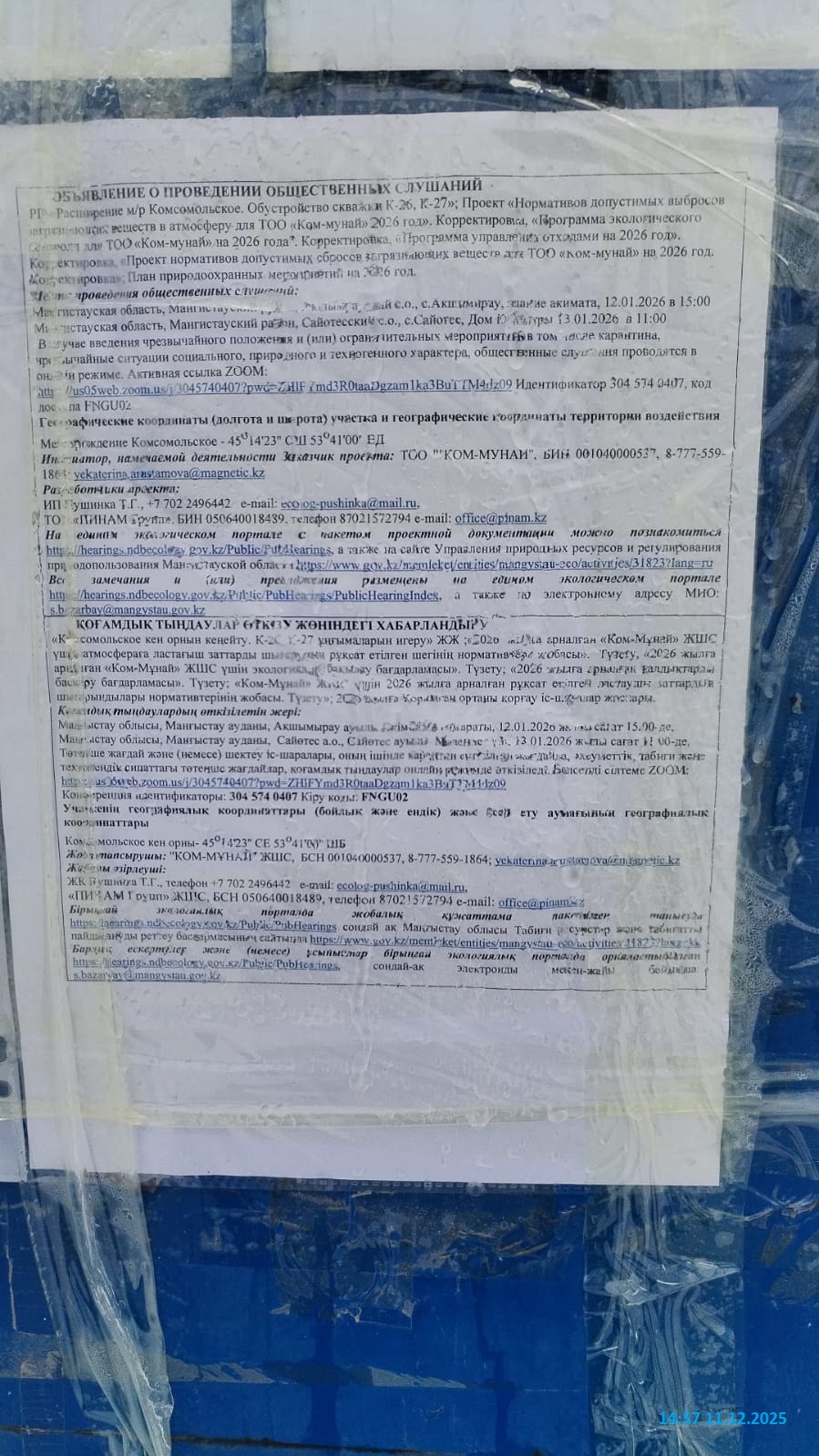 3. Общественные слушания организованны: Управление природных ресурсов и регулирования природопользования Мангистауской области, s.bazarbay@mangystau.gov.kz,