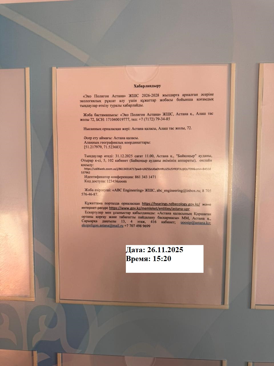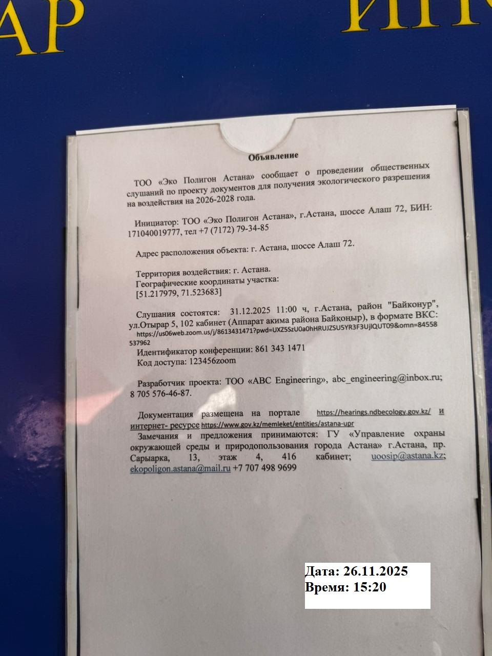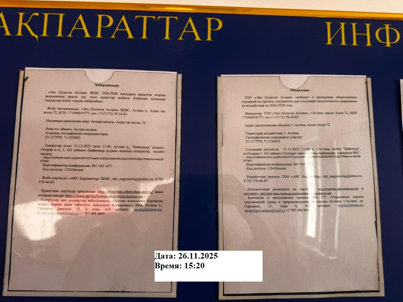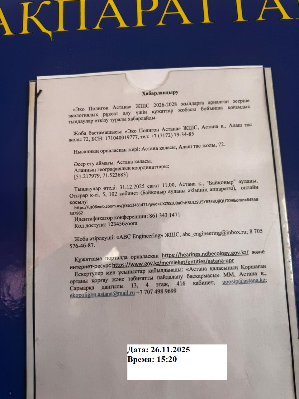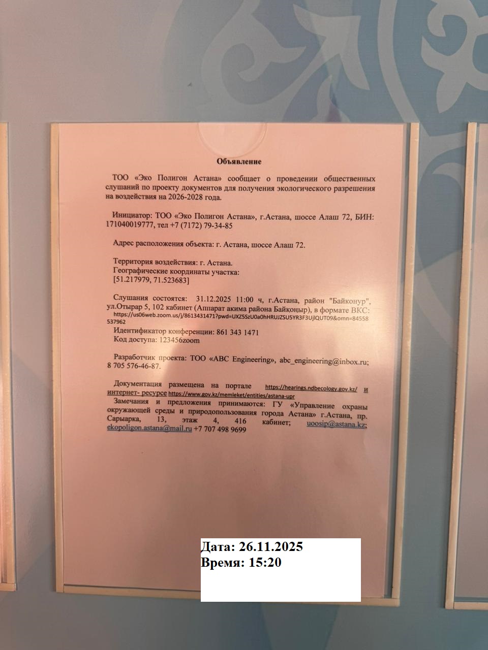 1.4. Описание для подключения к онлайн трансляции при прохождении общественного слушания: УООСП г. Астаны приглашает вас на запланированную конференцию: Zoom. Тема: Товарищество с ограниченной ответственностью ""Эко Полигон Астаны"" Время: 31 дек. 2025 11:00 Астана, Алматы Подключиться к конференции Zoom https://us06web.zoom.us/j/89114713899?pwd=B2v3VOwxfrZHKUim9h6ZXwwv3tMCGs.1 Идентификатор конференции: 891 1471 3899 Код доступа: 034440 --- Одно касание на мобильном телефоне +74992816543,,89114713899#,,,,*034440# Россия +74999516379,,89114713899#,,,,*034440# Россия Инструкции по подключению https://us06web.zoom.us/meetings/89114713899/invitations?signature=HISYCL1b-9UJYQFSHJ_z8sRPssjiwKN4Z04t-bEYQhU