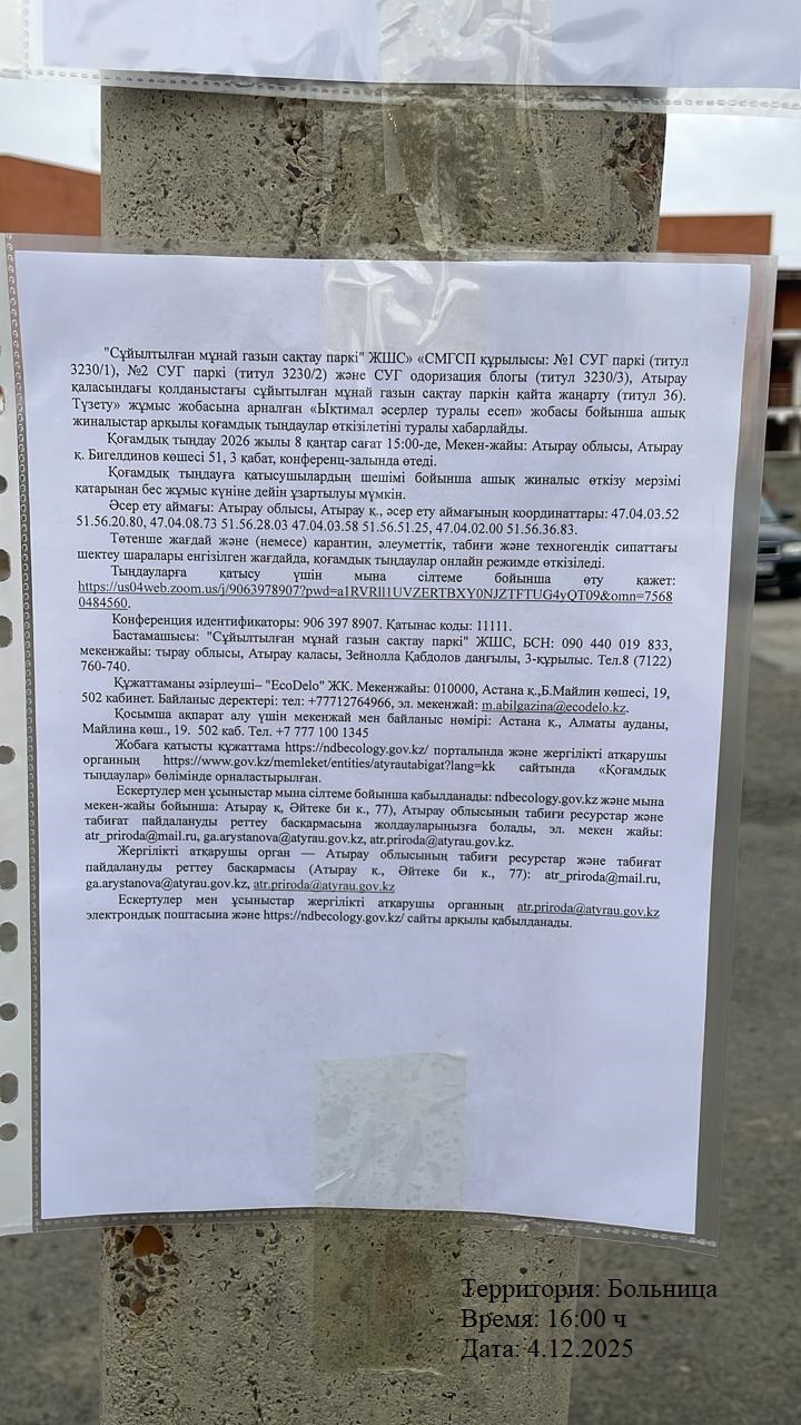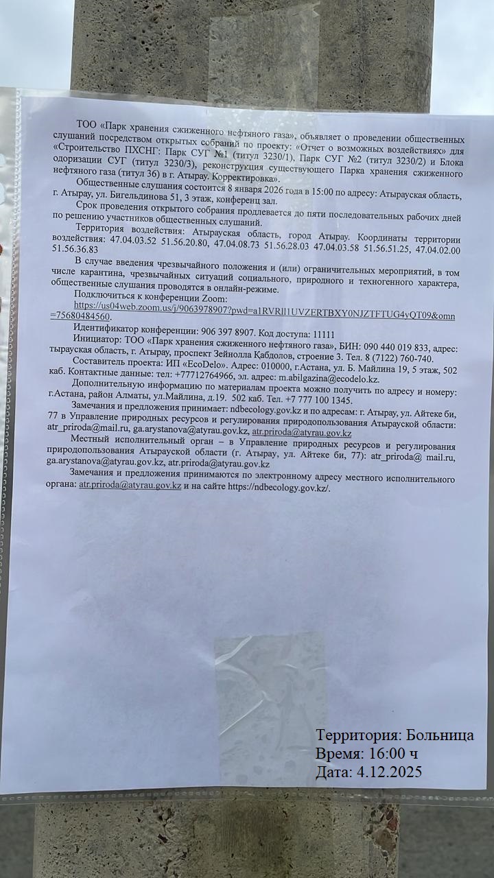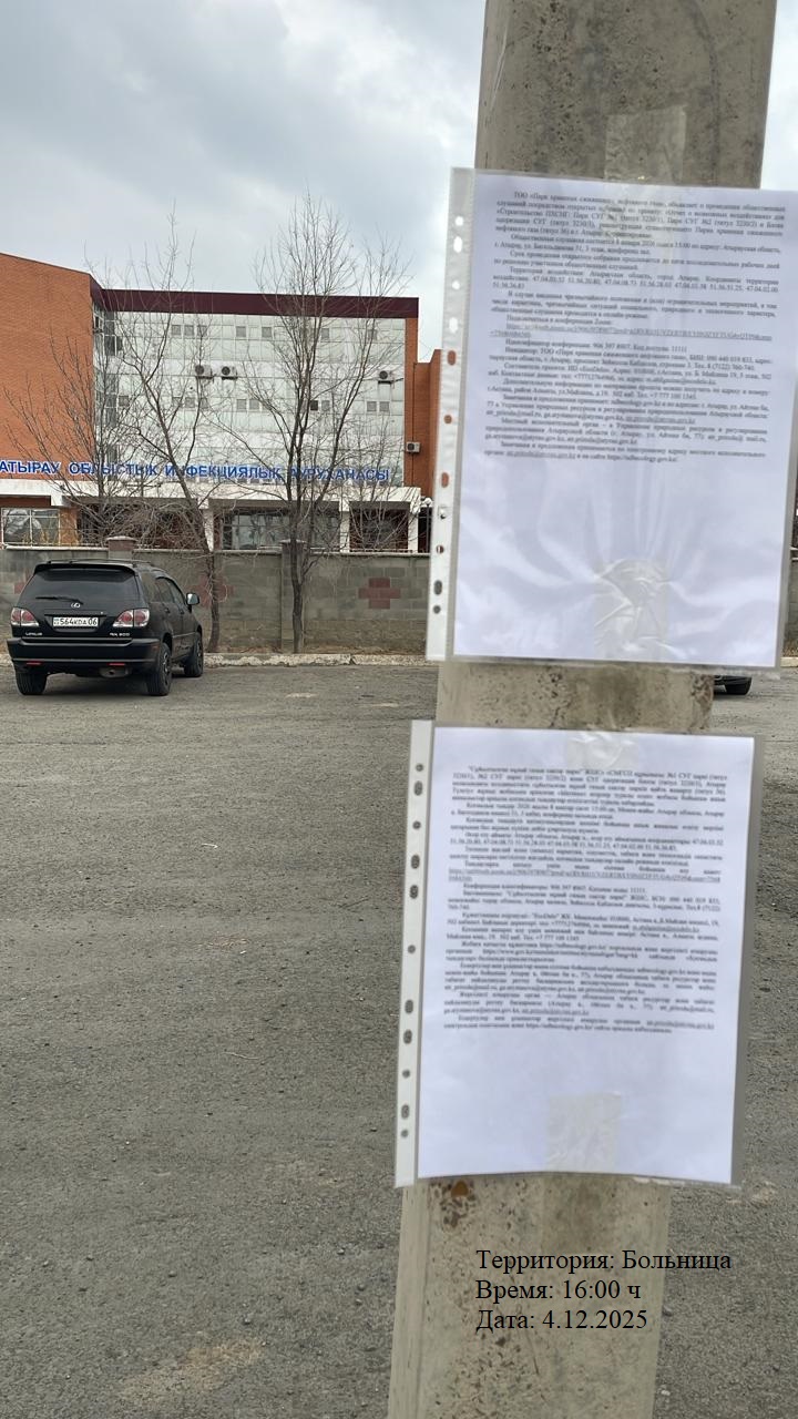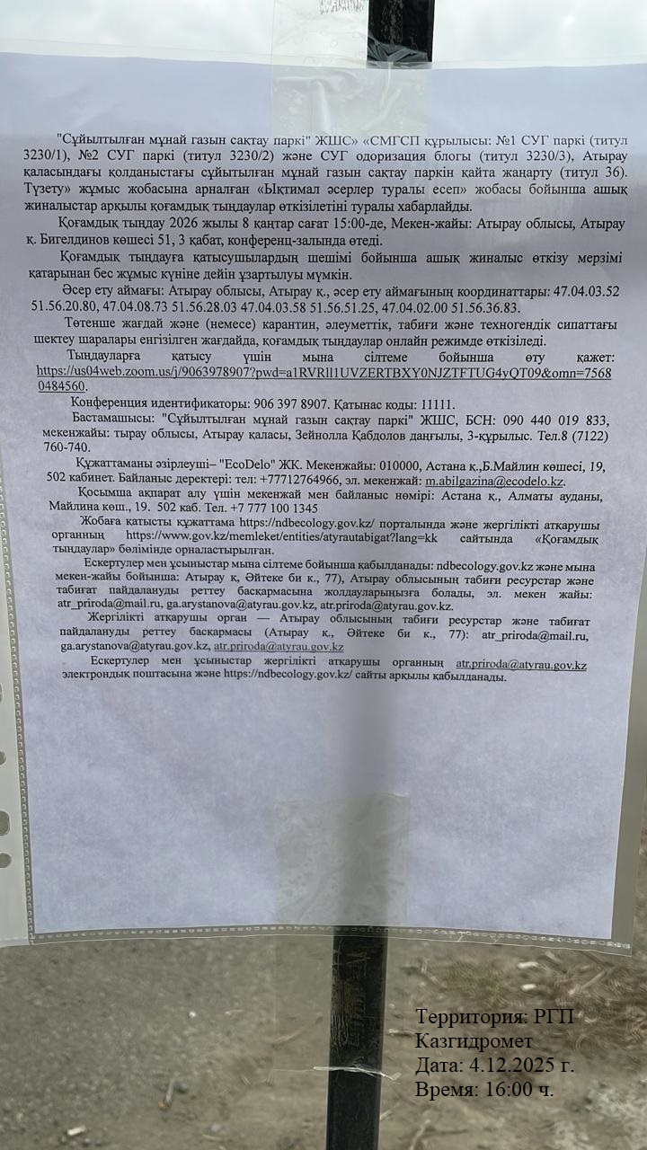 3. Общественные слушания организованны: Управление природных ресурсов и регулирования природопользования Атырауской области, atr.priroda@atyrau.gov.kz,