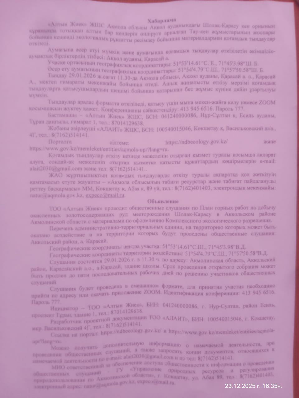 4. Повестка дня общественных слушаний: Золоторудное месторождение Шолак-Карасу находится в Аккольском районе Акмолинской области. Расстояния до районного центра г. Акколь - 53 км, до областного – г. Кокшетау – 215 км, до столицы г. Астана – 90 км. Ближайшие населенные пункты аул Каратобе и аул Карасай расположены в 10 км и 13,5 км, соответственно. Проектируемый объект распологается на территории Карайского сельского округа Аккольского района. При расчете рассеивания ЗВ программой ЭРА (версия 3.0), расчетным методом подтверждает отсутствия прямых и косвенных воздействий. Ближайшим водным объектом является река Шолак-Карасу, протекающая на расстоянии 140 м с северной стороны от месторождения. Указанные населенные пункты связаны между собой дорогами с твердым покрытием или улучшенными грунтовыми дорогами. По территории Аккольского района проходит железная дорога по нескольким направлениям: Алматы-Петропавловск, Кокшетау-Кызылорда и т.д., автомобильные дороги международного, республиканского и областного значения, что делает привлекательным развитие промышленности. Ближайшим крупнейшим предприятиям является филиал АО «ГМК Казахалтын» рудник Жолымбет. Местное население занято в горнодобывающей промышленности (рудник Жолымбет) и в сельском хозяйстве. В период 2005-2015 годов, комплекс геологоразведочных работ выполнен силами ТОО «Алтын Жиек» с привлечением подрядчиков для производства буровых, лабораторных и технологических, гидрогеологических и инженерно-геологических исследований. По результатам геологоразведочных работ выявлены два мелких золоторудных месторождения Арктас и Шолак-Карасу, связанных с развитием зоны окисления по минерализованным зонам штокверкого, прожилкового типа с рассеянной сульфидной минерализацией. На основании положительных результатов геологоразведочных работ, специалистами ТОО «ГРС консалтинг» разработано ТЭО промышленных кондиций для условий открытой отработки по состоянию на 01.07.2015г. В ТЭО произведены повариантный подсчет запасов и экономические расчеты месторождения Шолак-Карасу по вариантам бортовых содержаний золота: 0,2; 0,3; 0,5 г/т применительно к современным условиям. В 2023 году специалистами ТОО «BAITAS GEOLOGY» по заявке и за счет средств ТОО «Алтын Жиек» выполена переоценка запасов из категории С2 в категорию С1 золотосодержащих руд на месторождении «Шолак-Карасу» расположенного в пределах Аксу-Жолымбетской контрактной территории в Акмолинской области по состоянию на 01.09.2023 года. Геолого-экономическая оценка запасов месторождения в контурах открытой добычи по вариантам бортовых содержаний золота показали наибольшую эффективность для открытой отработки запасов по бортовому содержанию золота 0,2 г/т. В ТЭО определены гидрогеологические и горнотехнические параметры открытой отработки месторождения. Обоснована система отработки месторождения открытым способом, оптимизирована глубина карьера. Экологическая обстановка контролируется и обеспечивается выполнением широкомасштабной программы экологического контроля, начиная со стадии поисков и разведки по настоящее время. Запасы месторождения Шолак-Карасу утверждены протоколом № 2614-23-У заседания ГКЗ от 22.11.2023 года.