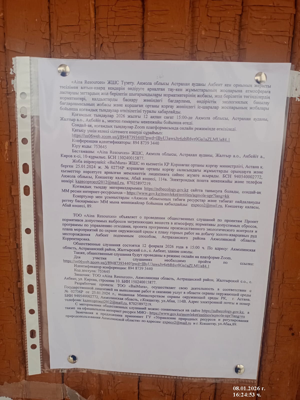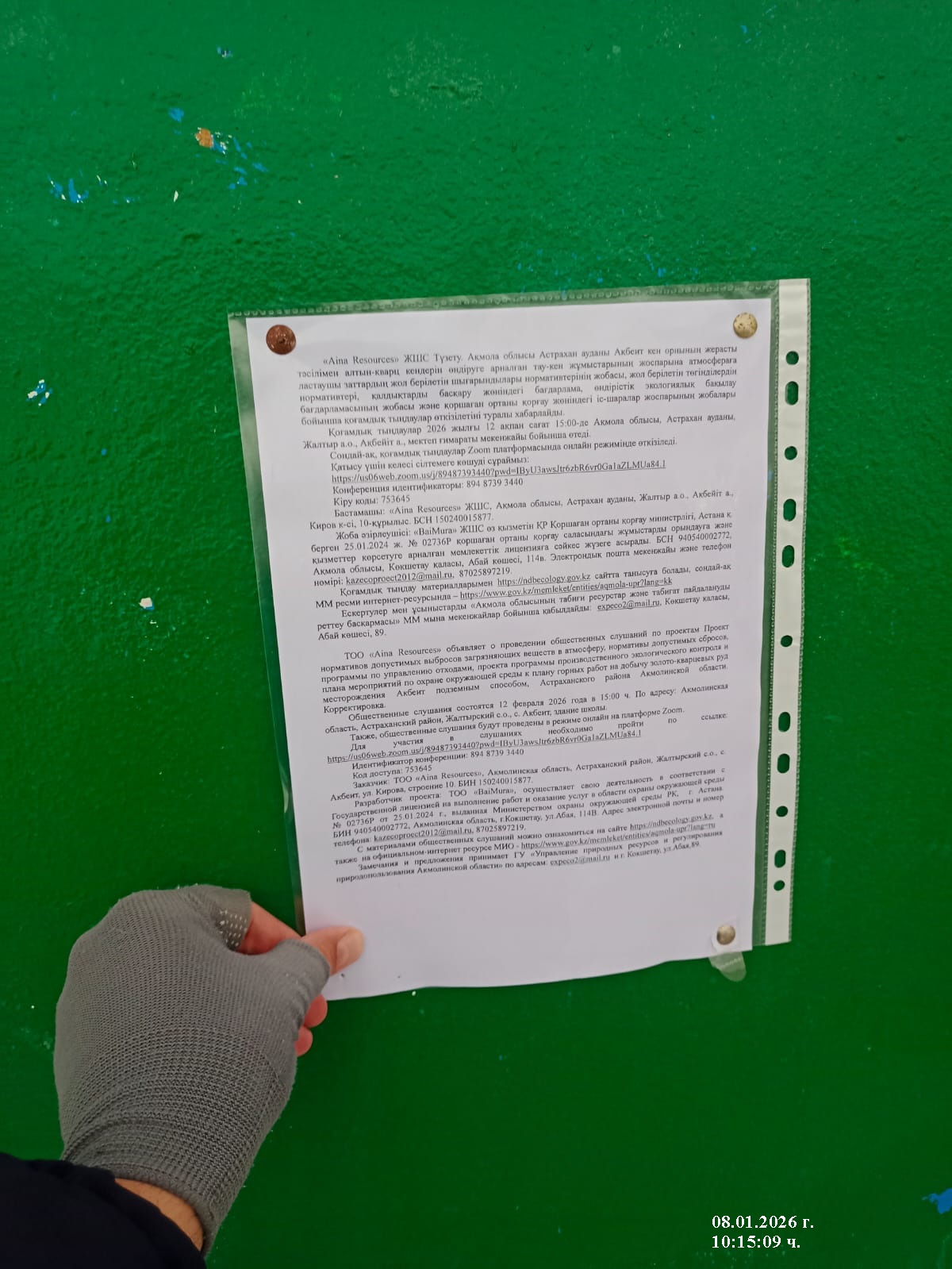 3. Общественные слушания организованны: Управление природных ресурсов и регулирования природопользования Акмолинской области, expeco@mail.ru,