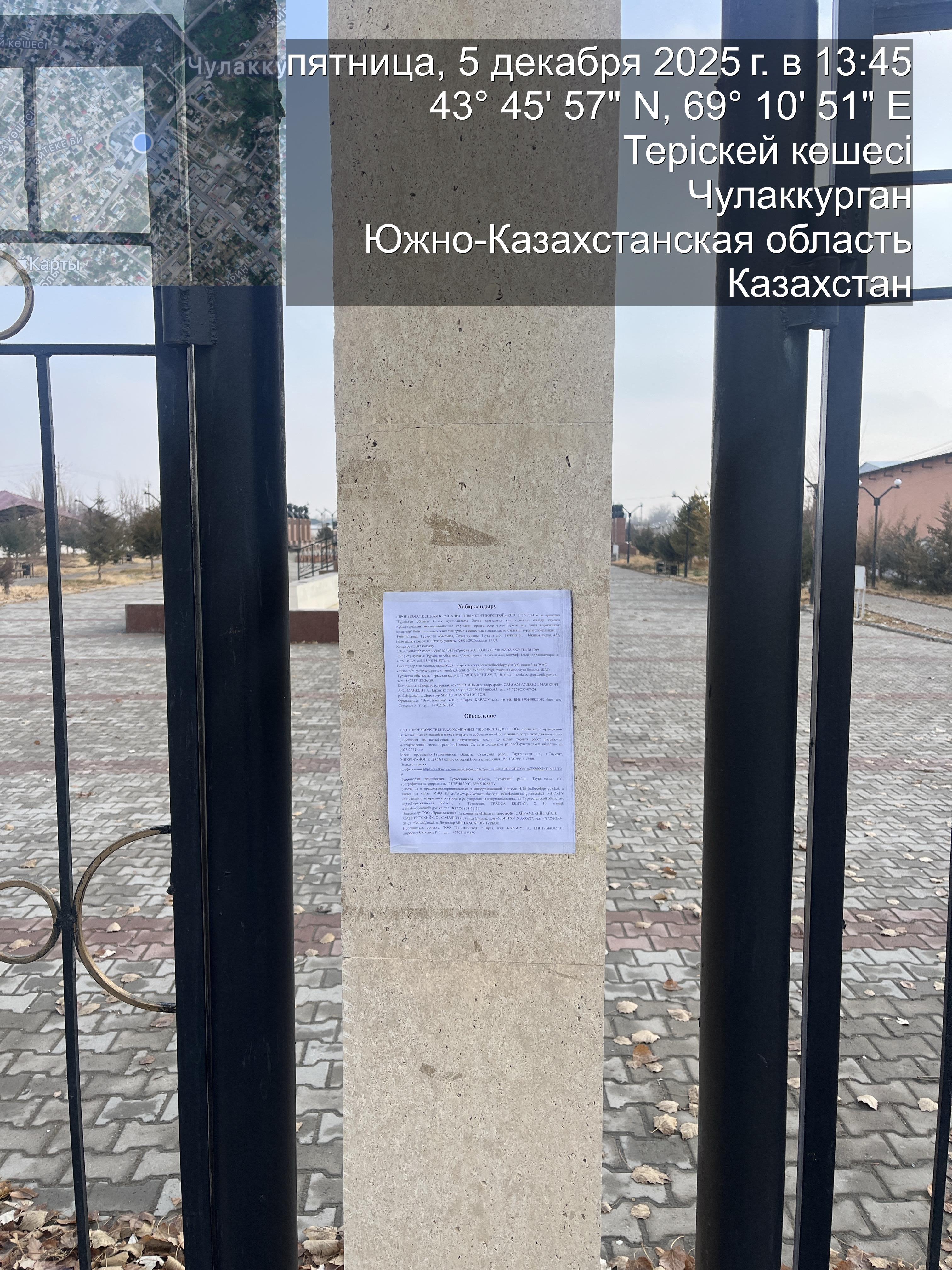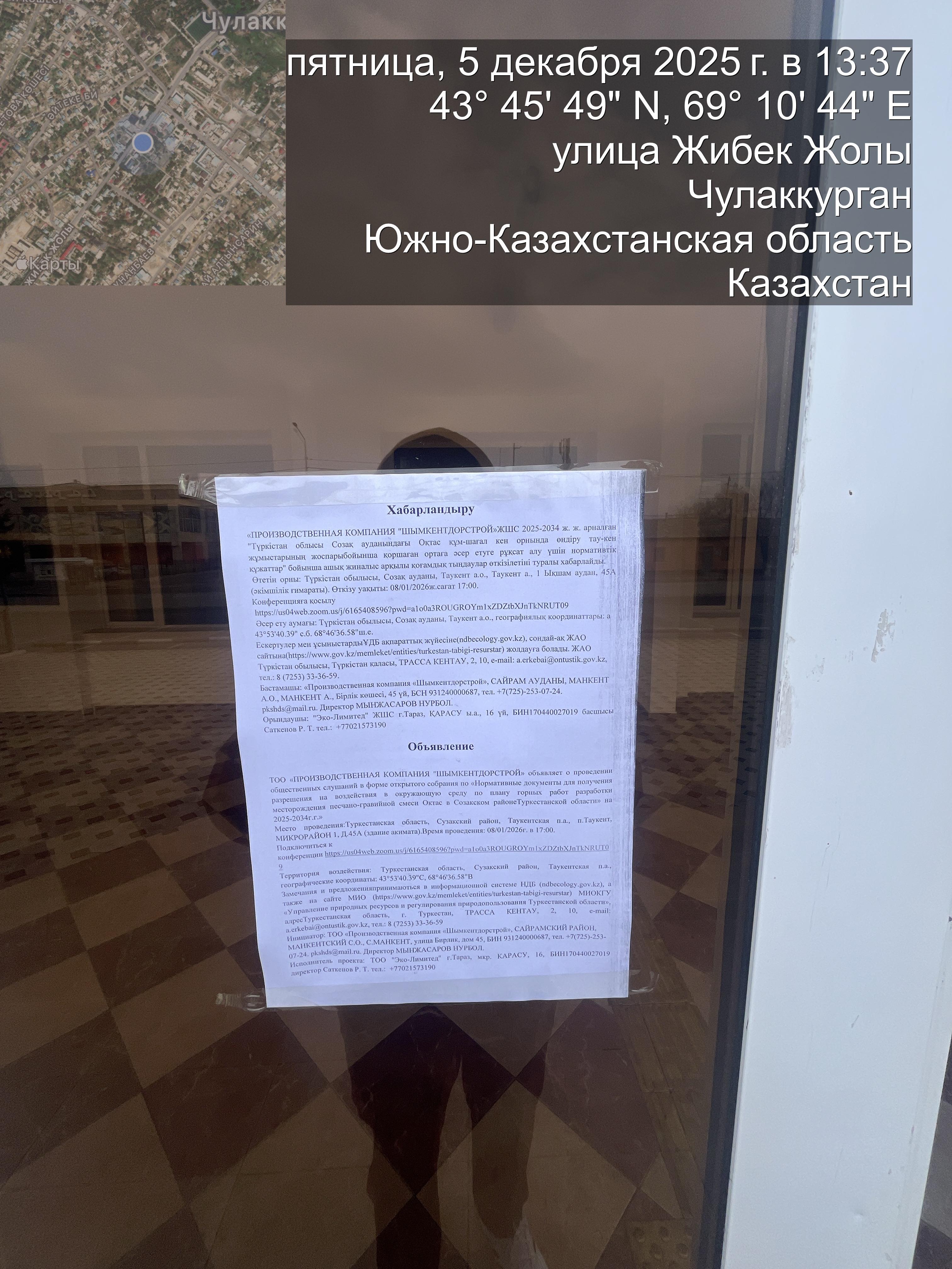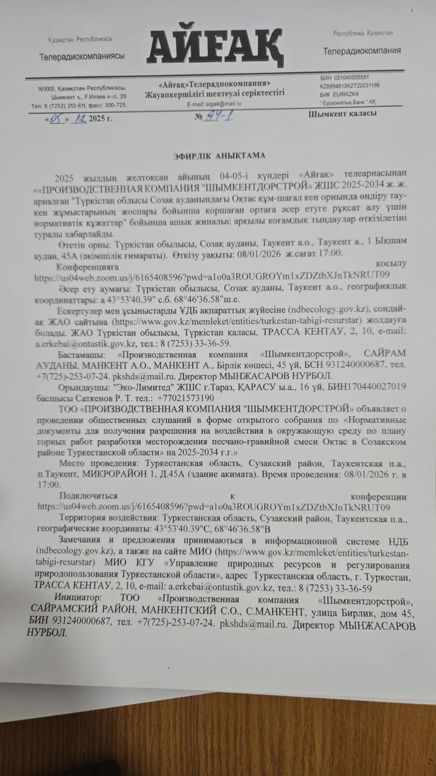 3. Общественные слушания организованны: Управление природных ресурсов и регулирования природопользования Туркестанской области, a.erkebai@ontustik.gov.kz,