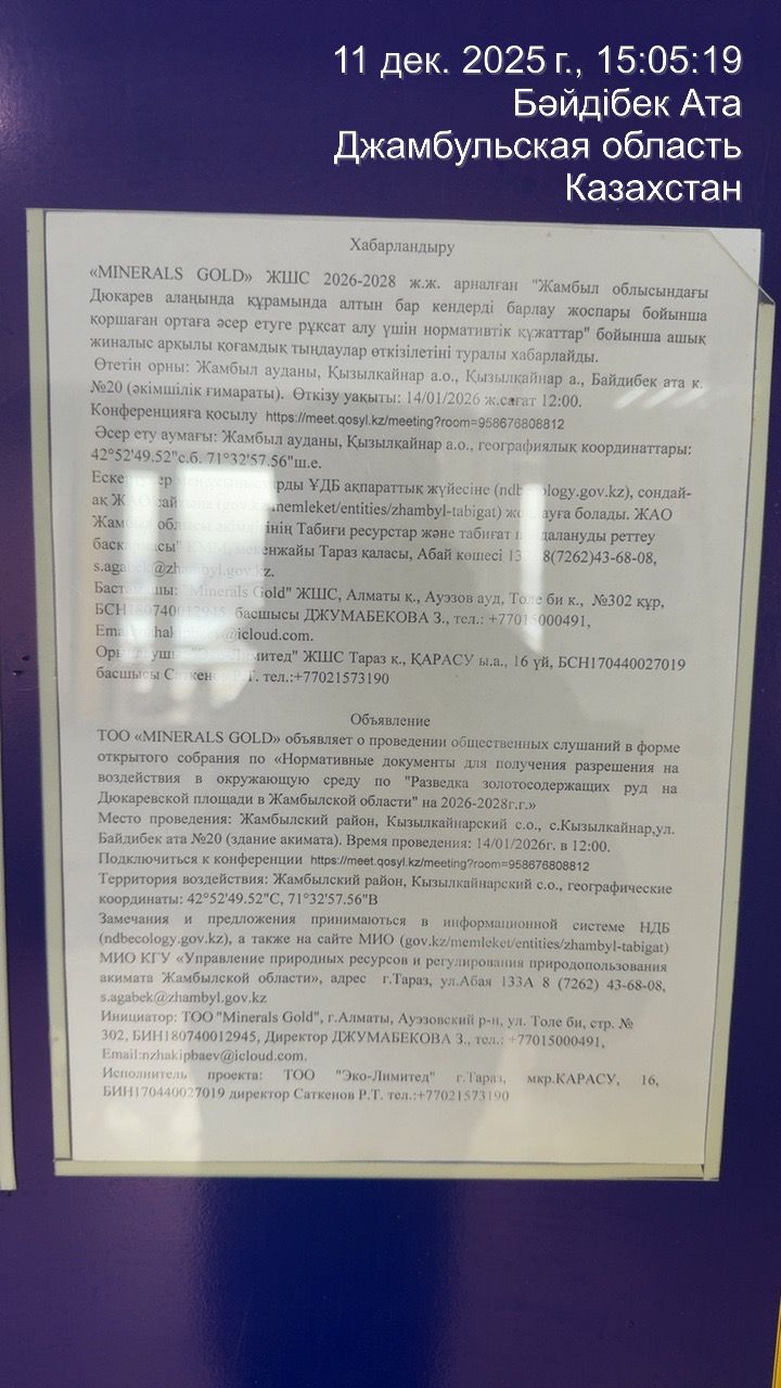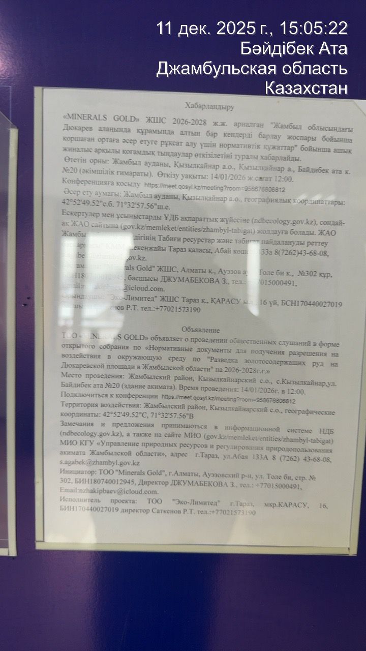 По проекту: Нормативные документы для получения разрешения на воздействия в окружающую среду по "Разведка золотосодержащих руд на Дюкаревской площади в Жамбылской области" на 2026-2028 г.г.