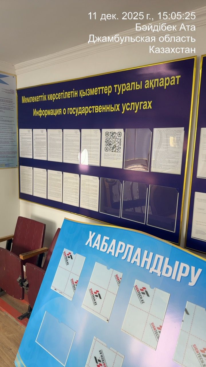 6.3. расположение мест, специально предназначенных для Размещения печатных объявлений (доски объявлений): Доска объявлении перед акиматом ул. Байдибек ата №20