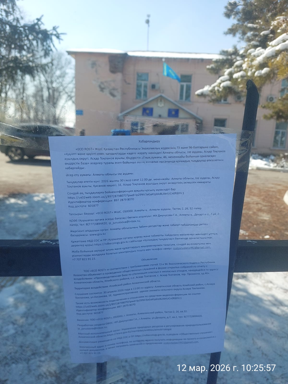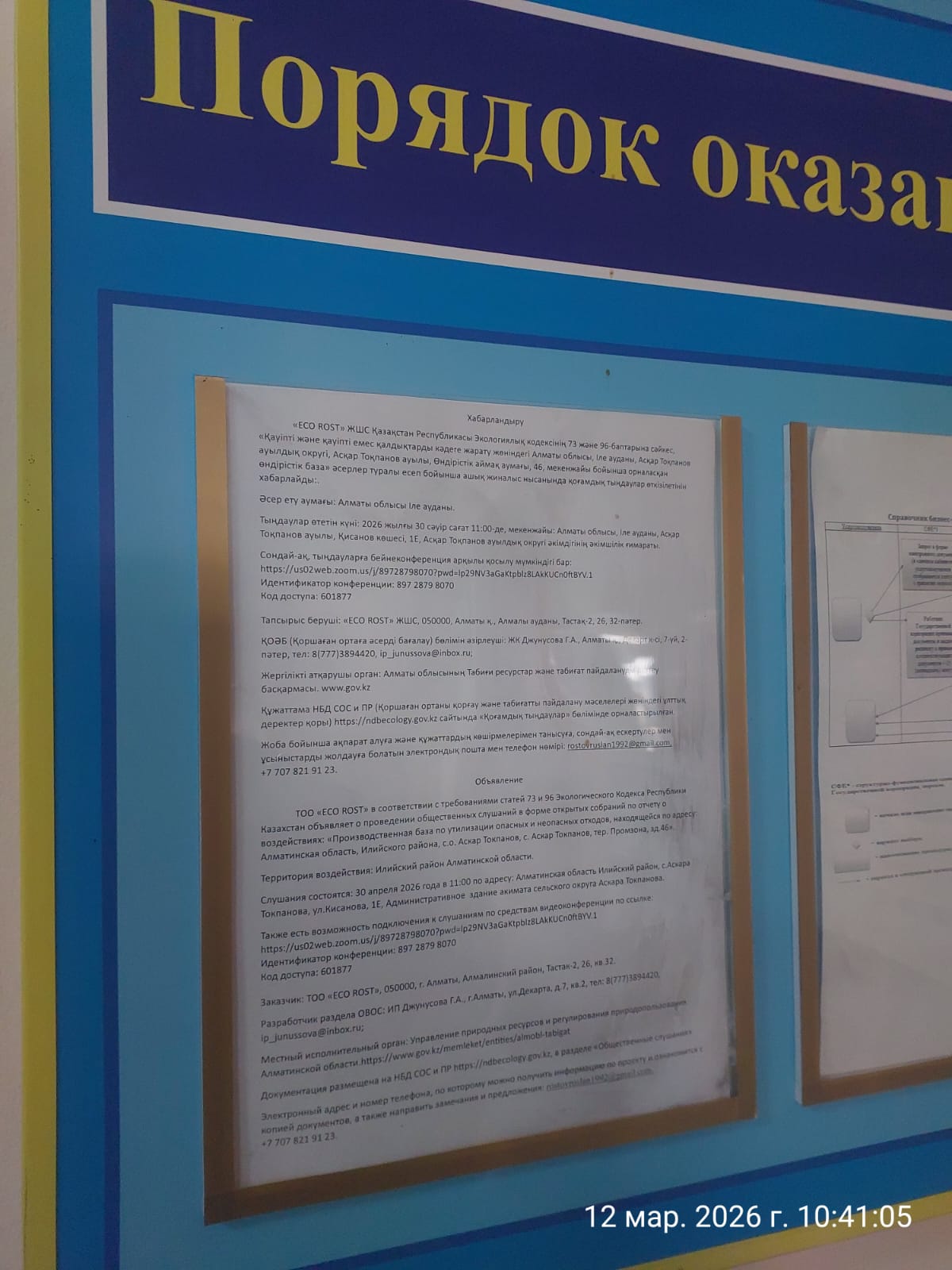 По проекту: «Производственная база по утилизации опасных и неопасных отходов, находящейся по адресу: Алматинская область, Илийского района, с.о. Аскар Токпанов, с. Аскар Токпанов, тер. Промзона, зд.46 РКА0201600049603490, ТОО «ECO ROST»