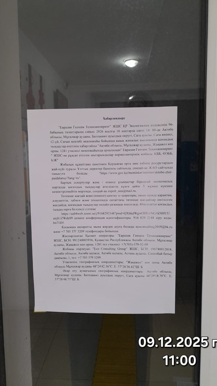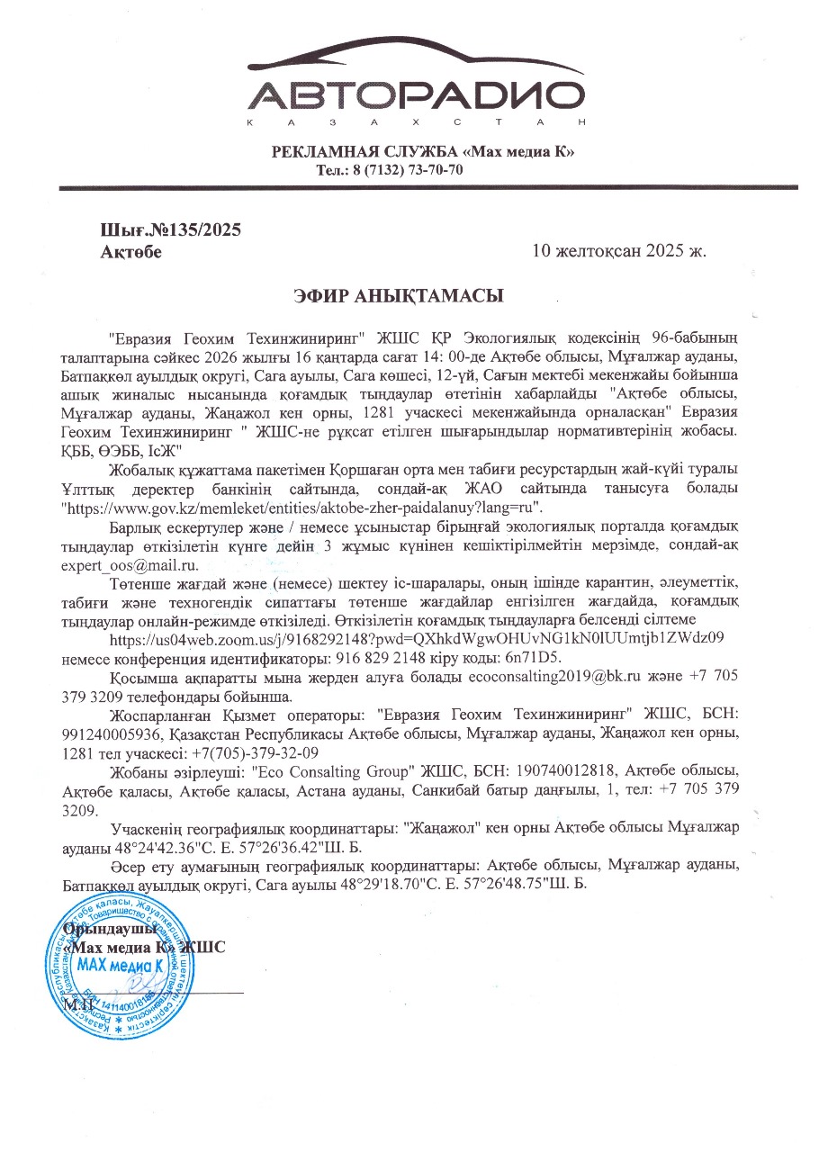 4. Повестка дня общественных слушаний: Разработка проекта нормативов предельно-допустимых выбросов (ПДВ) загрязняющих веществ в атмосферу для ТОО «Евразия Геохим Техинжиниринг» на основании существующей технологии производства, с учетом произошедших изменений, подготовлен специалистами ТОО «Eco Consalting Group», обладающей Государственной Лицензией на выполнение работ и оказание услуг в области охраны окружающей среды № 02113Р от 14.08.2019 / Основанием для разработки проекта нормативов предельно-допустимых выбросов (ПДВ) загрязняющих веществ в атмосферу являются: - Определение категории объекта с 3 до 1 категории. Справочно: в 2021 году 6 сентября была определена 3 категория, РГУ «Департаментом экологии Актюбинской области». 22.10.2025 г. согласно письму РГУ «Департамента экологии Актюбинской области», было рекомендовано переопределить категорию объекта с 3 на 1-ю. Во исполнения требований РГУ «Департамента экологии Актюбинской области» нами разработан проект для получение разрешения на воздействия для объектов 1 категории. Станция по приготовлению химреагентов введен в эксплуатацию с 01 марта 2018 года. В проекте определены, рассчитаны и систематизированы характеристики источников выделений и выбросов загрязняющих веществ. Основной деятельностью ТОО «Евразия Геохим Техинжиниринг» является приготовление технической смеси (растворов) с использованием химических реагентов для нефтедобывающей отрасли. На территории станции по приготовлению химреагентов ТОО «Евразия Геохим Техинжиниринг», расположенного на месторождении Жанажол Мугалжарского района Актюбинской области (участок 1281) на существующее положение выявлено всего – 23 стационарных источника выбросов загрязняющих веществ(ЗВ), из них организованные – 5 ед., неорганизованные – 18 ед. Количество выброса загрязняющих веществ составляет всего по предприятию в количестве – 17.858033392 т/год, в том числе: твердых – 0.000115 т/год, газообразные и жидкие – 17.857918392 т/год. (Приложение 1, Бланк инвентаризации). Согласно условию методики по определению нормативов ПДВ, выбросы предприятия принимаются за предельно-допустимые, так как максимальные приземные концентрации выбрасываемых веществ на границе санитарно-защитной зоны не превышают ПДК для населенных мест. Срок достижения ПДВ – 2026 г. Сравнительная таблица источников выбросов с действующим проектом ОВОС Активная ссылка проводимых общественных слушаний https://us04web.zoom.us/j/9168292148?pwd=QXhkdWgwOHUvNG1kN0lUUmtjb1ZWdz09 или Идентификатор конференции: 916 829 2148 Код доступа: 6n71D5.