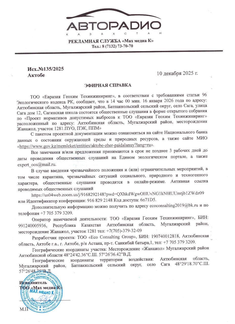 По проекту: Проект нормативов допустимых выбросов к ТОО «Евразия Геохим Техинжиниринг» расположенный по адресу: Актюбинская область, Мугалжарский район, месторождения Жанажол, участок 1281.ПУО, ПЭК, ППМ